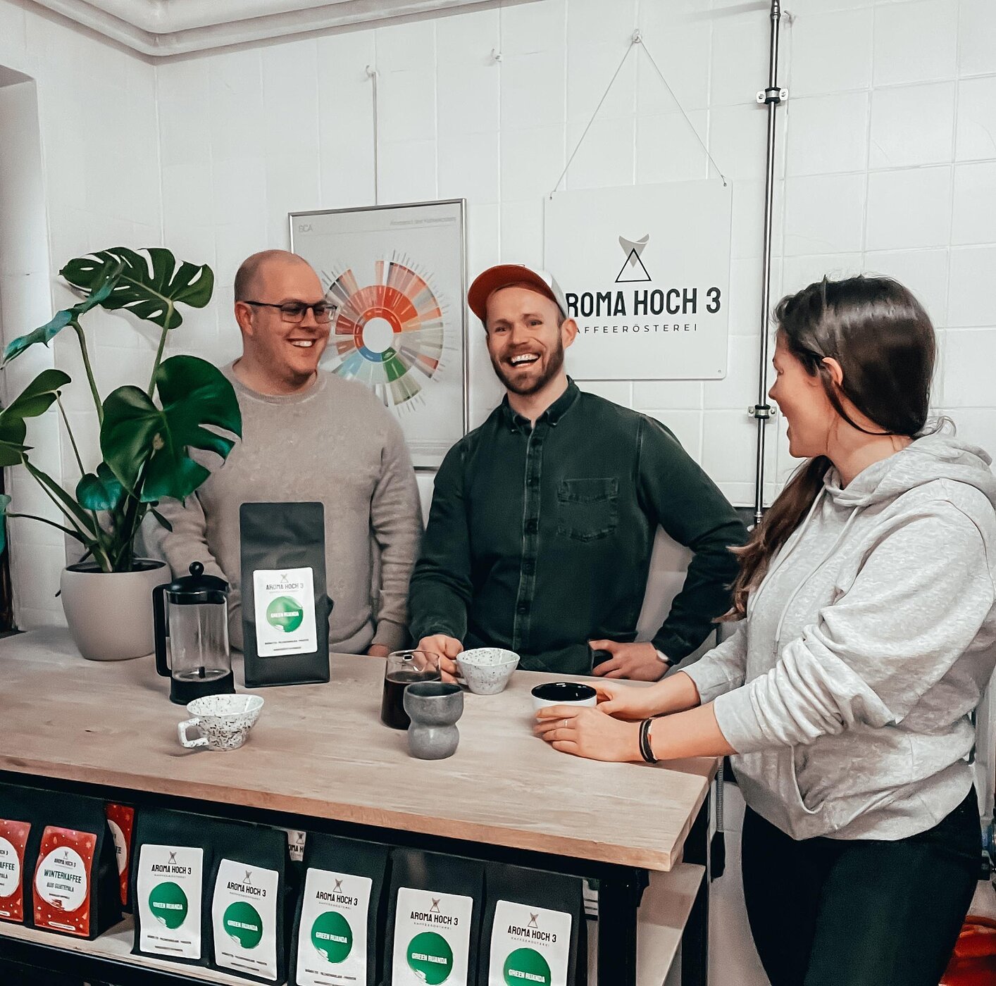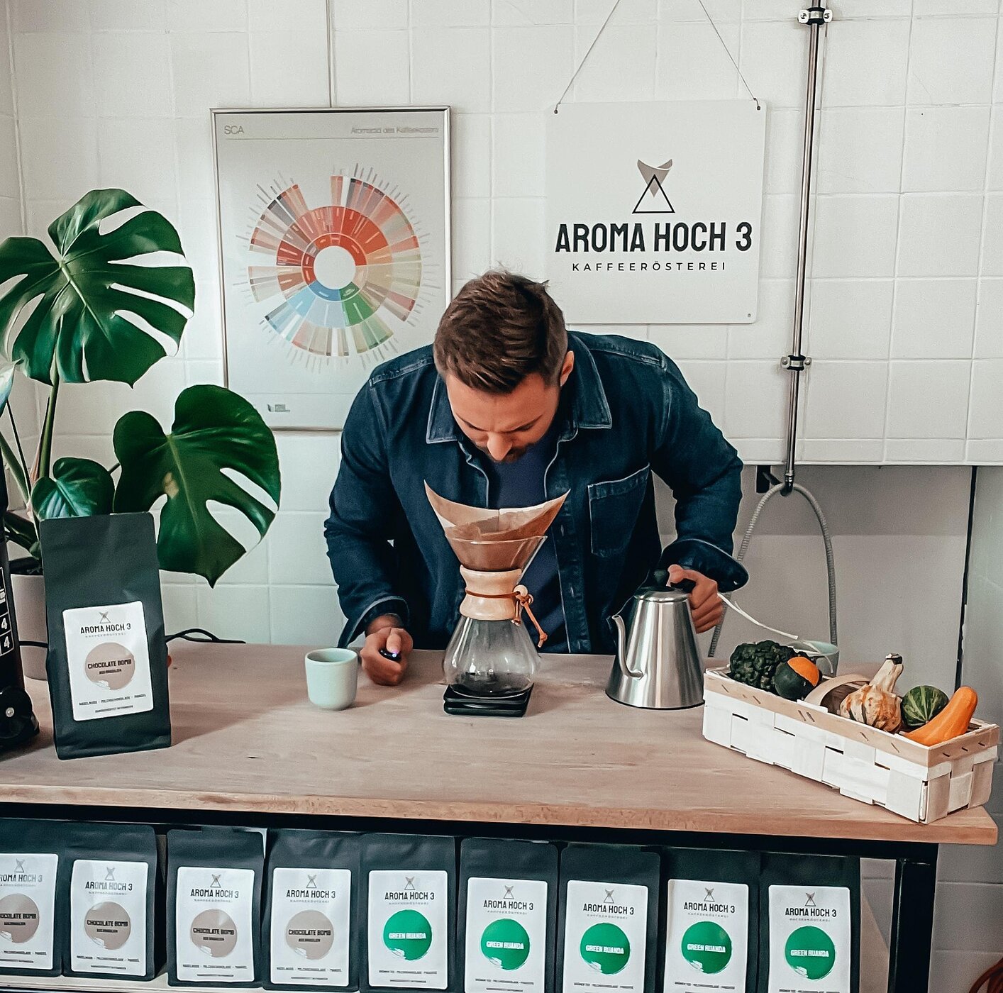 "Wir sind eine junge Kaffeerösterei aus dem Fränkischen Seeland und wir von Aroma Hoch 3 haben es uns zur Aufgabe gemacht, dir das Genusserlebnis Hoch 3 zu bieten! Für unsere Spezialitätenkaffees wählen wir die Rohbohnen von Farmern bzw. Kooperativen mit einem hohen Qualitätsbewusstsein aus, damit wir die besonderen Aromen des Ursprungslandes und der jeweiligen Saisonalität in den Vordergrund stellen können. Wir setzen den Fokus auf Qualität, Nachhaltigkeit und Transparenz. Wer guten Kaffee schätzt, wird unsere Kaffees lieben! Komm einfach bei uns in der Rösterei vorbei und du kannst noch mehr über das Thema erfahren."