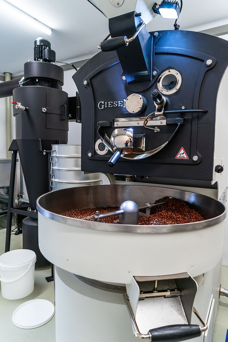 Wir rösten traditionell im schonenden Trommelröstverfahren an unserem 6kg Röster von Giesen. Das macht den Unterschied zum herkömmlichen Industriekaffee. Unsere Röstung dauert zwischen 12 und 15 Minuten und hat eine Höchsttemperatur von maximal 215°C, wohingegen der normale Supermarktkaffee oftmals nur wenige Minuten bei um die 450°C geröstet wird.