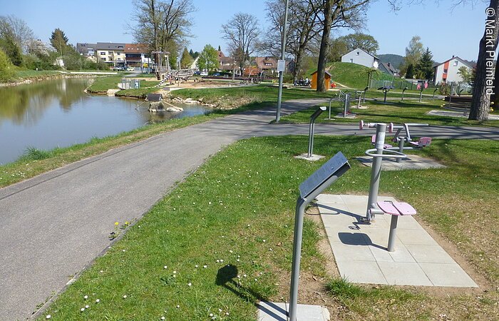Auf dem Mehrgenerationenspielplatz am Bahnweiher können sich Kinder, junge Erwachsene, Senioren sowie Personen mit Gehhilfen körperlich betätigen.