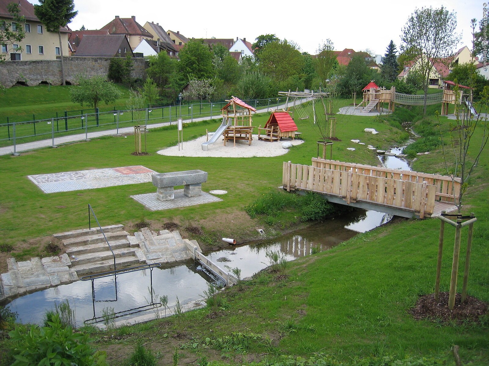 Reizvoll an der mittelalterlichen Stadtmauer und der Eschenbach gelegen, bietet der Ritterspielplatz einige Attraktionen: Eine 30 Meter lange Seilbahn, eine Rammbock-Schaukel, eine Burg mit Hängebrücke und viele andere Holzbauten im mittelalterlichen Stil.