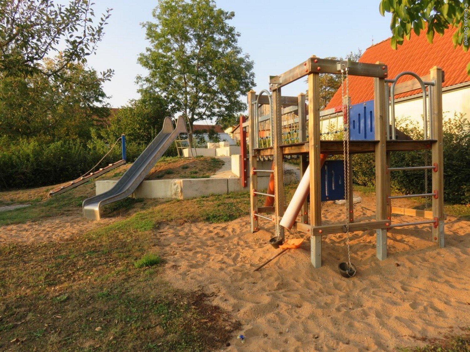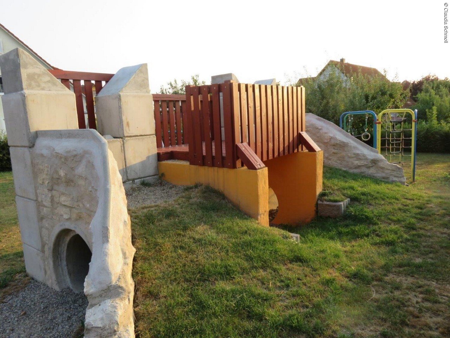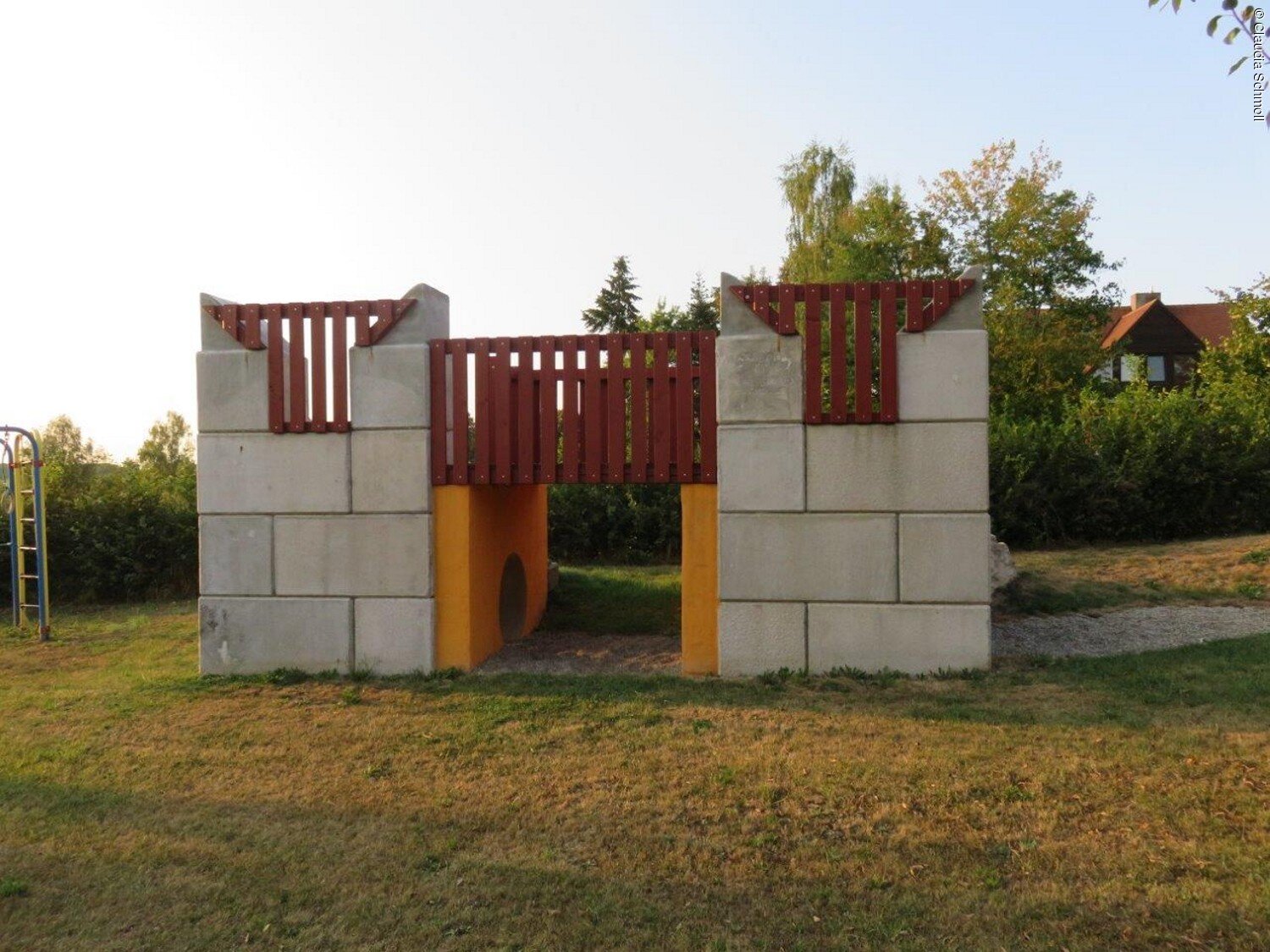Der Spielplatz im Baugebiet hinter der Kirche wurde 2016 neu angelegt und lädt seither zum Spielen und Toben ein. Er ist mit einem römischen Wachturm, einem Klettergerüst, einer Korbschaukel, einem Erlebnishügel u.v.m. ausgestattet.