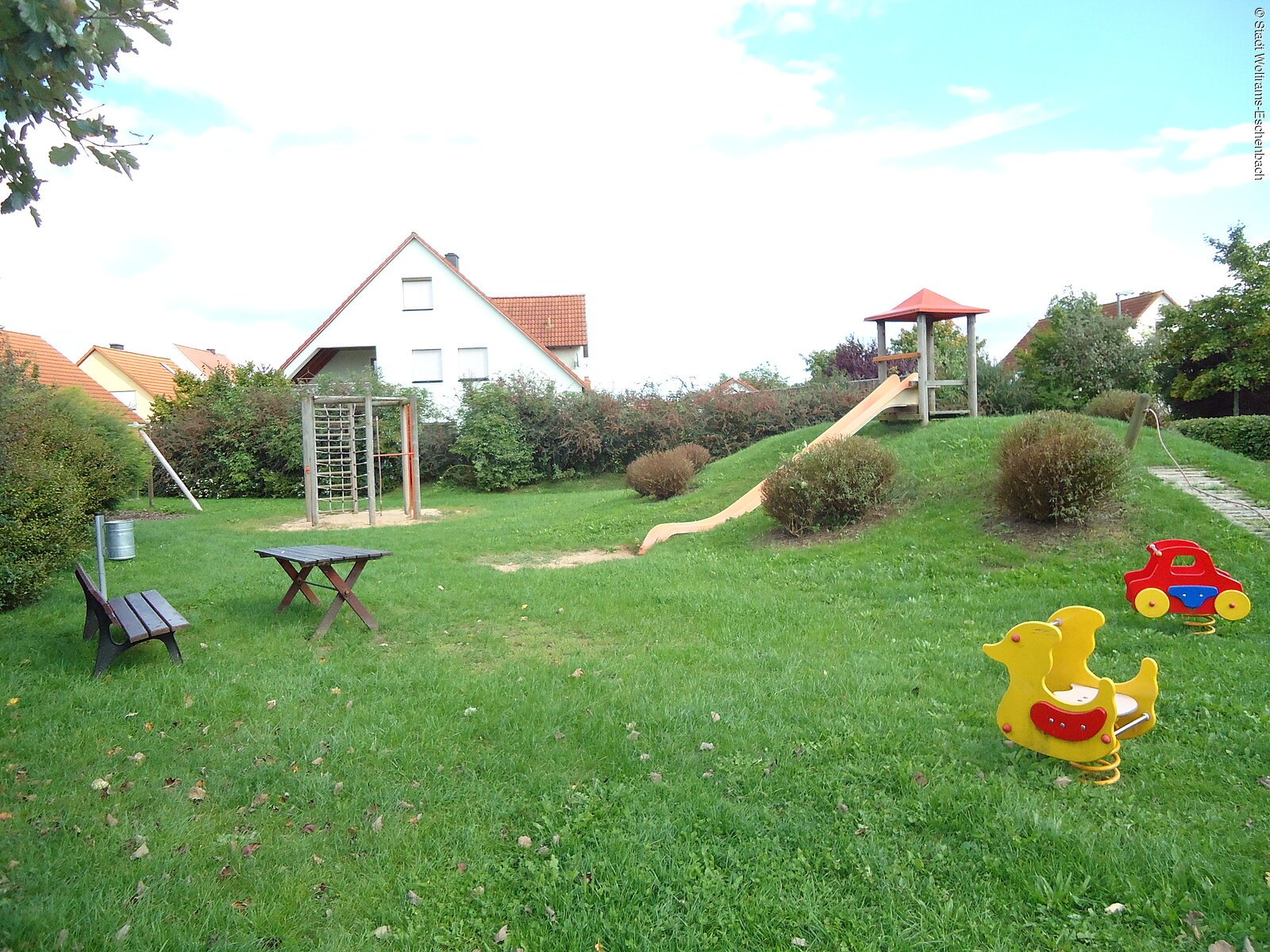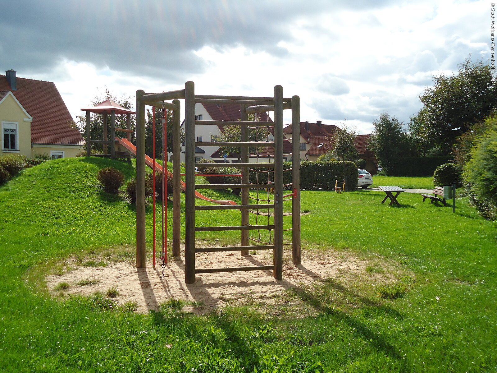 Dieser Spielplatz ist einer von sieben Spielplätzen in Wolframs-Eschenbach und bietet den Kindern jede Menge Spiel und Spaß. Mit einer Schaukel, einem Sechseck-Klettergerät, einer Rutsche, zwei Federschaukelpferden, einem Sandkasten und einem Schrägaufstieg mit Seil gehört dieser Spielplatz bestimmt zu den Favoriten der Kinder. Auch die Eltern können sich hier erholen und ihren Kindern von der Sitzmöglichkeit aus, beim Spielen zu schauen.