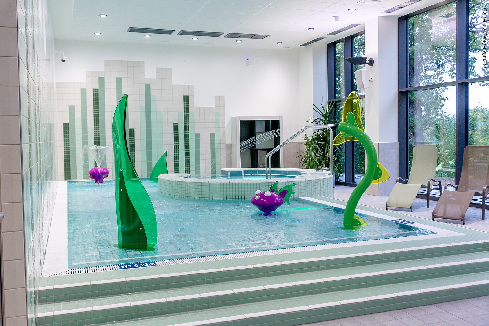 Kleinkinderbecken mit Wasser-Spielgeräten.