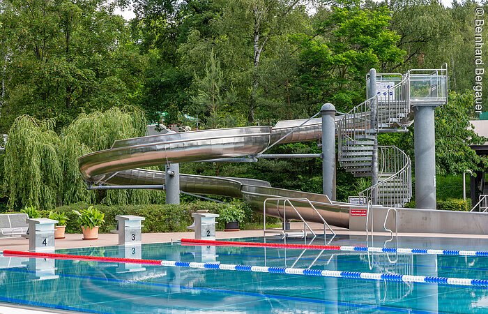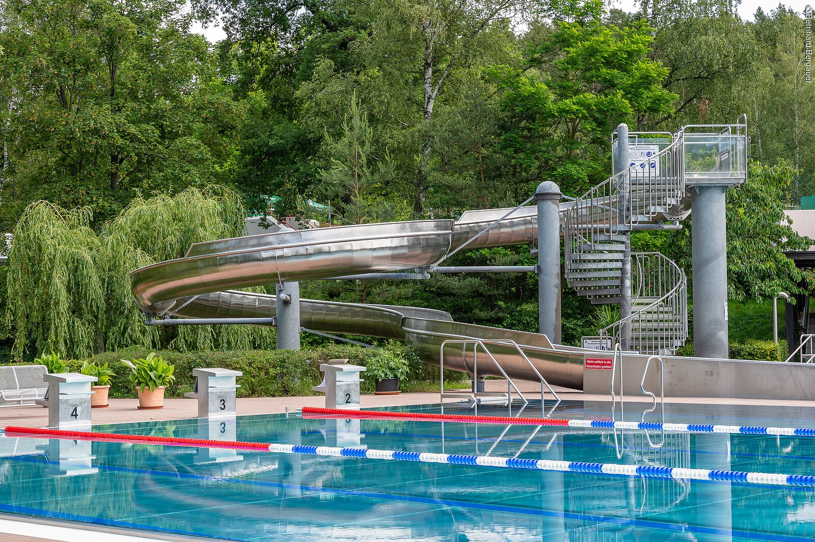 Neben einem Schwimmerbecken von 50x15m warten ein Nichtschwimmerbecken mit einer 45-m-Rutsche, eine große Liegewiese und ein Beachvolleyball-Feld im Sommer auf die Gäste. Außerdem haben die kleinen Badbesucher ein eigenes Kinderplanschbecken mit Rutsche und eine Liegewiese mit Schattenplatz.