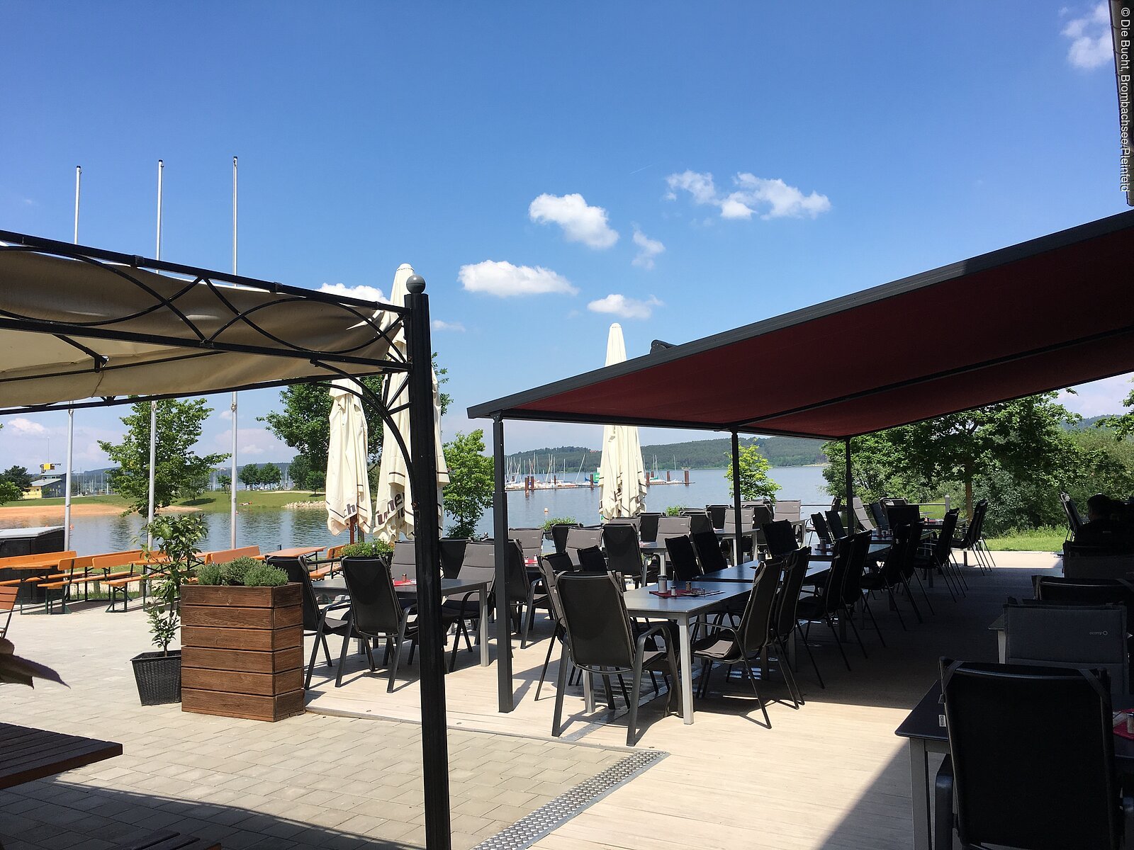 Einen aktiven Tag auf oder am See gepflegt starten, stilvoll eine Pause einlegen oder entspannt ausklingen lassen: dafür bietet "Die Bucht" in Ramsberg ideale Voraussetzungen. Direkt am Fuß- und Radweg rund um den See sowie gleich neben Spielplatz, Strand und Hafen gelegen, kann man sich hier auf der sonnigen Terrasse, im Biergarten oder der chilligen Open Air-Lounge mit wechselnden Speisen, Kaffee und Kuchen oder einem Cockail gastronomisch verwöhnen lassen - ganiert mit einem wunderbaren Blick auf die charakteristische Ramsberger Bucht und das maritime Treiben im größten Binnensegelhafen Deutschlands.
