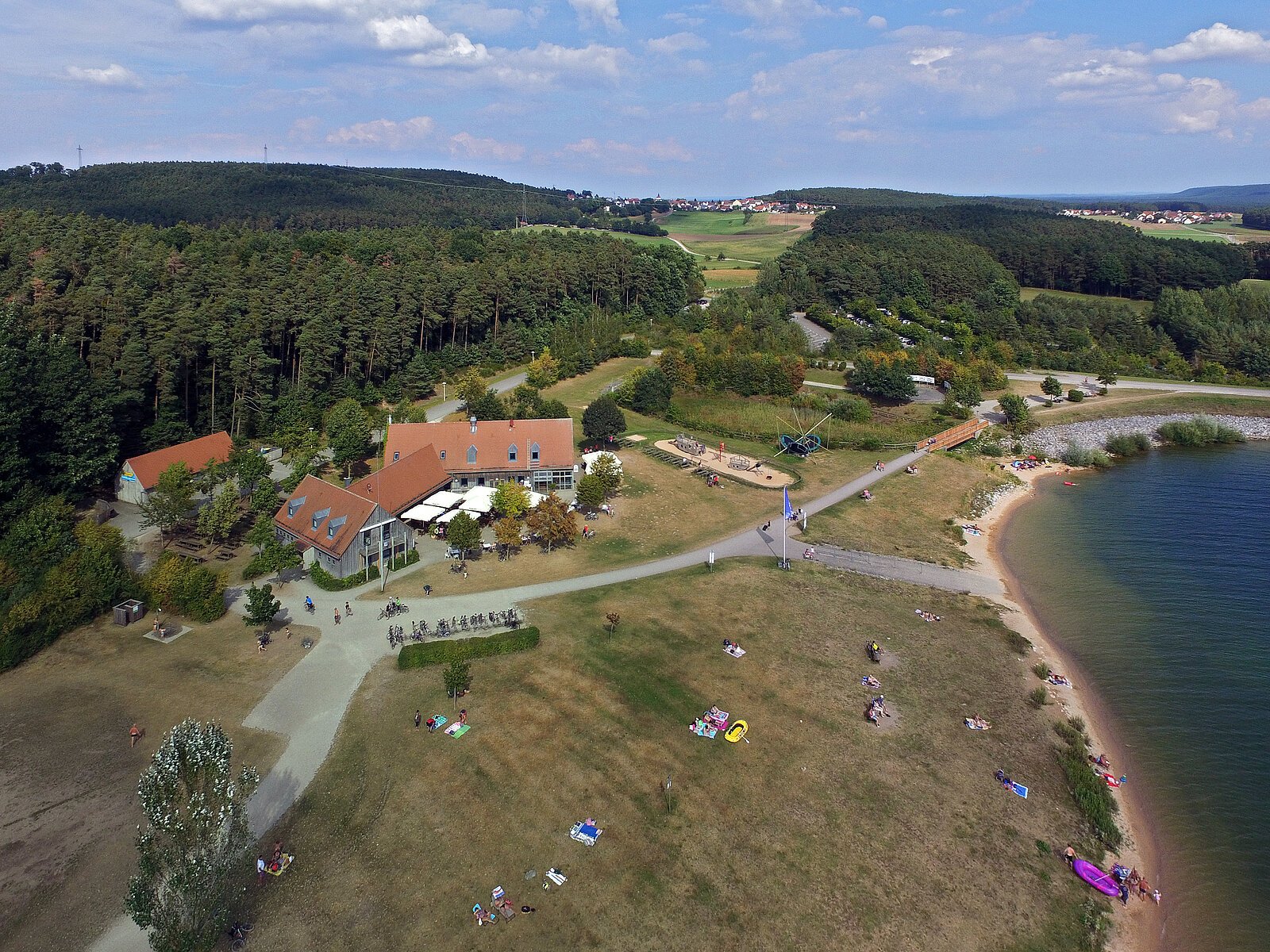 Ein Blick von der Sonnenterrasse des Sand & Sofa Allmannsdorf - und man ist raus aus der Enge des Alltags. Gleich neben dem größten Strand und am Hauptdamm des Großen Brombachsees gelegen, kann man hier bei traumhafter Aussicht ganz entspannt die mediterrane Küche genießen. Bequem: Die Anlegestelle der "MS Brombachsee" liegt direkt vor der Tür, Kinder können sich auf dem großen Spielplatz nebenan austoben.