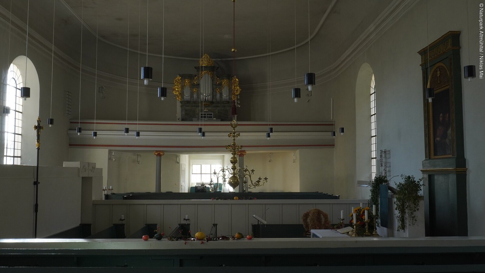 Die Burg bestand aus einer niedriger gelegenen Vor- und überhöhten Hauptburg und war mit ihren Wallanlagen die größte hochmittelalterliche Burganlage im Landkreis Gunzenhausen. Im 14. Jh. sank der Glanz der Truhendinger durch Verschuldung und unglückliche Heiraten mit Blutsverwandten. Nach mehrmaligem Besitzerwechsel ging die Burg 1404 an die Burggrafen von Nürnberg. 1732, mittlerweile ein "sehr altes Gebäu", enthielt das Schloss die Wohnung für den Oberamtmann. Die heutige Kirche wurde in den Jahren 1818/19 erbaut, zuvor - 1722 - wurde Hohentrüdingen eine eigene Pfarrei. Der Kirchturm stammt noch aus dem 12. Jh., er ist der Bergfried der alten Burg, die 1812 abgebrochen wurde. Von diesem Turm, der frei zugänglich ist, hat man einen sehr schönen Ausblick auf den Hesselberg und ins Ries.
