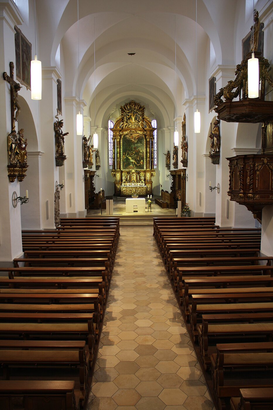 Es gibt keine Hinweise, dass der Raum über eine Stuck- und Freskoausstattung verfügt hätte. Diesen Eindruck der Nüchternheit versuchte man im Rahmen einer Restaurierung im Jahre 1939 abzuhelfen und gestaltete die Mittelschiffwände mit großformatigen Kreuzwegstationen. Das erste Chorjoch flankieren zwei Sakristeien, die äußerlich nicht abgesetzt sind. An dieser Stelle wird das frühere Querhaus vermutet. Von der Krypta hat sich nur ein Joch erhalten. Es ist von außen zugänglich. Eingespannt zwischen den Türmen liegt eine Vorhalle, auf der die Orgelempore aufgesetzt ist. Im erhaltenen Nordturm befindet unter dem Bodenniveau die Laurentiuskapelle, die mit Resten gotischer Wandmalerei ausgestattet ist. An den ehemaligen Südturm ist eine Ölbergkapelle angebaut, die spätgotische Skulpturen enthält.