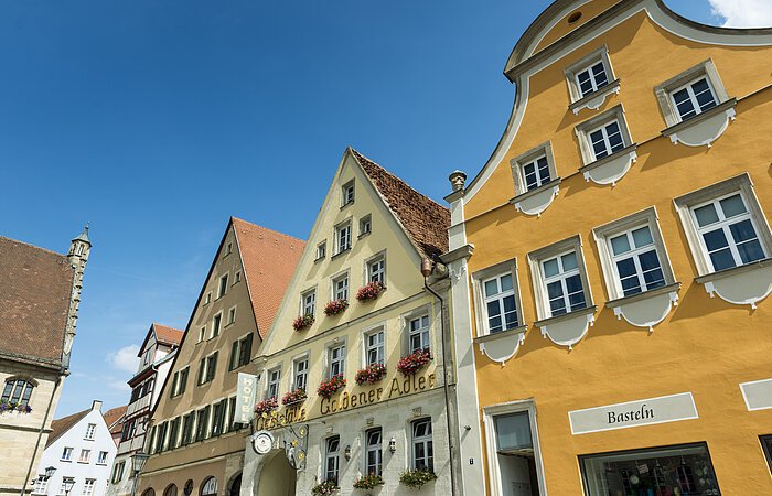 Noch heute zeugen u. a. die weitgehend erhaltene Stadtbefestigung mit 38 Türmen und dem einzig erhaltenen Stadttor - dem Ellinger Tor - mit dem staufischen Reichsadler in der Mitte und den beiden städtischen Wappen von 1241 bzw. 1481, das Reichsstädtische (Alte) Rathaus (1470-80), die St. Andreas-, die Spital- und die Karmeliterkirche von der großen Zeit der Stadt, als noch die "Schwingen des Adlers", also der Kaiser, nominell über ihr stand.