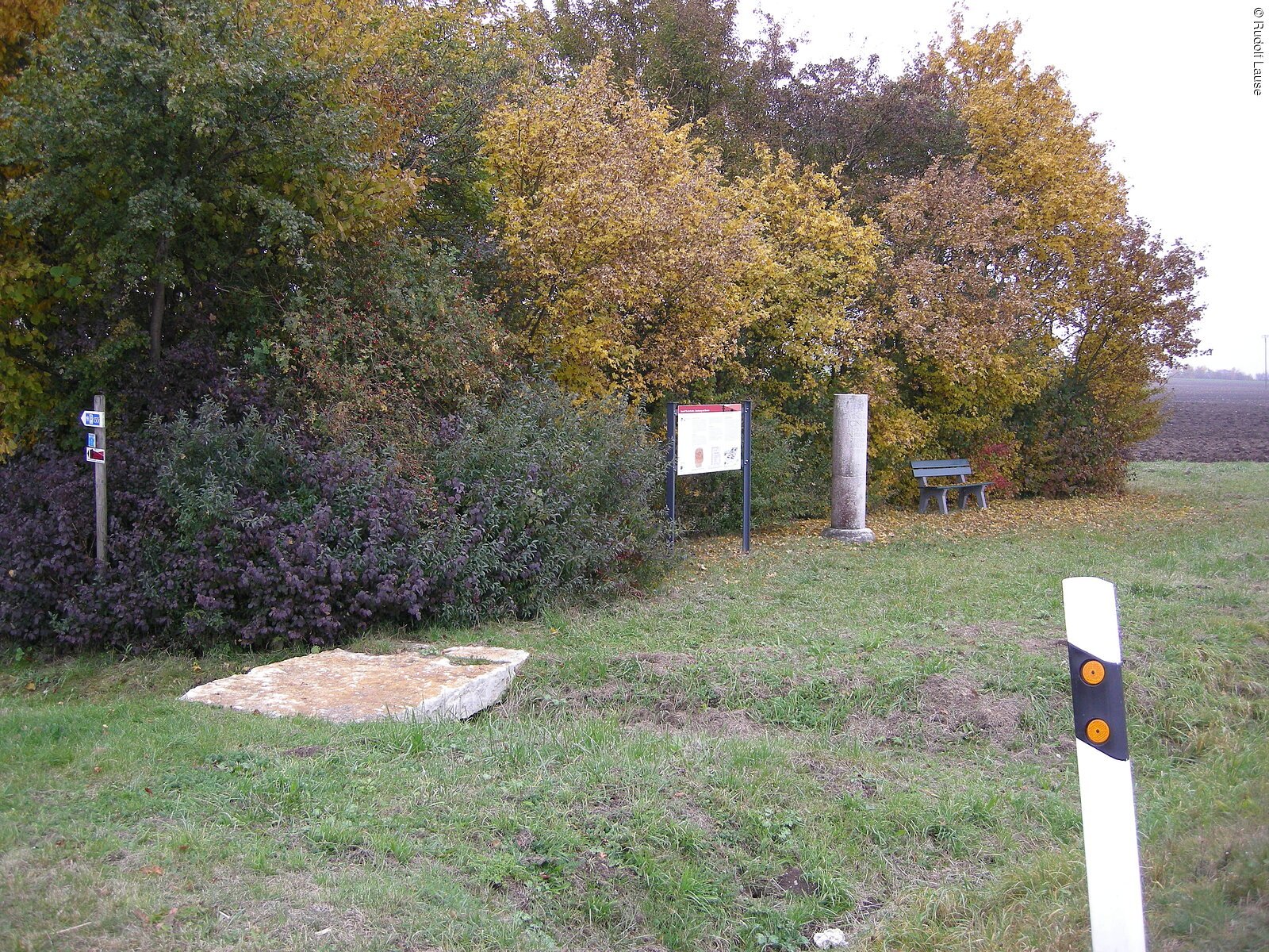 Eine Infotafel steht an einem gepflügten Feld. Im hiintegrund grüne Wiesen und ein Wald.