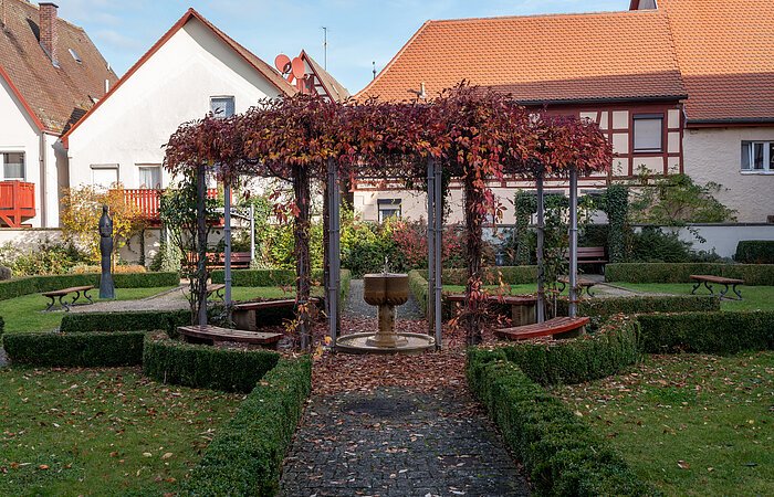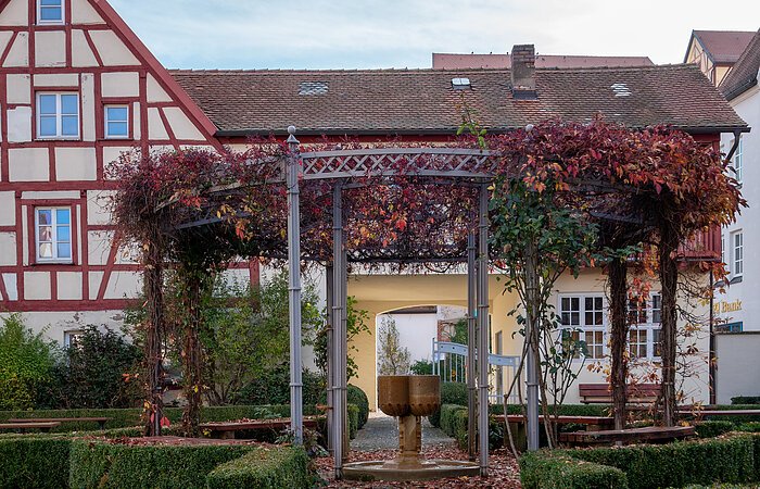 Der Klostergarten des 1325 gestifteten Karmeliterklosters ist ca. 719 m² und wurde lange als Brauereihof genutzt. Nach dem Ankauf durch die Stadt wurde der Garten im Jahre 2000 in Anlehnung an historische Vorgaben gestaltet und für die Öffentlichkeit zugänglich gemacht. Akzente setzen die Bronzeskulptur der heiligen Walburga, ein Werk des Bildhauers Ernst Steinacker (Spielberg) und ein Brunnen als vergrößerte Nachbildung des Lichtersteins aus dem Reichsstadtmuseum.
