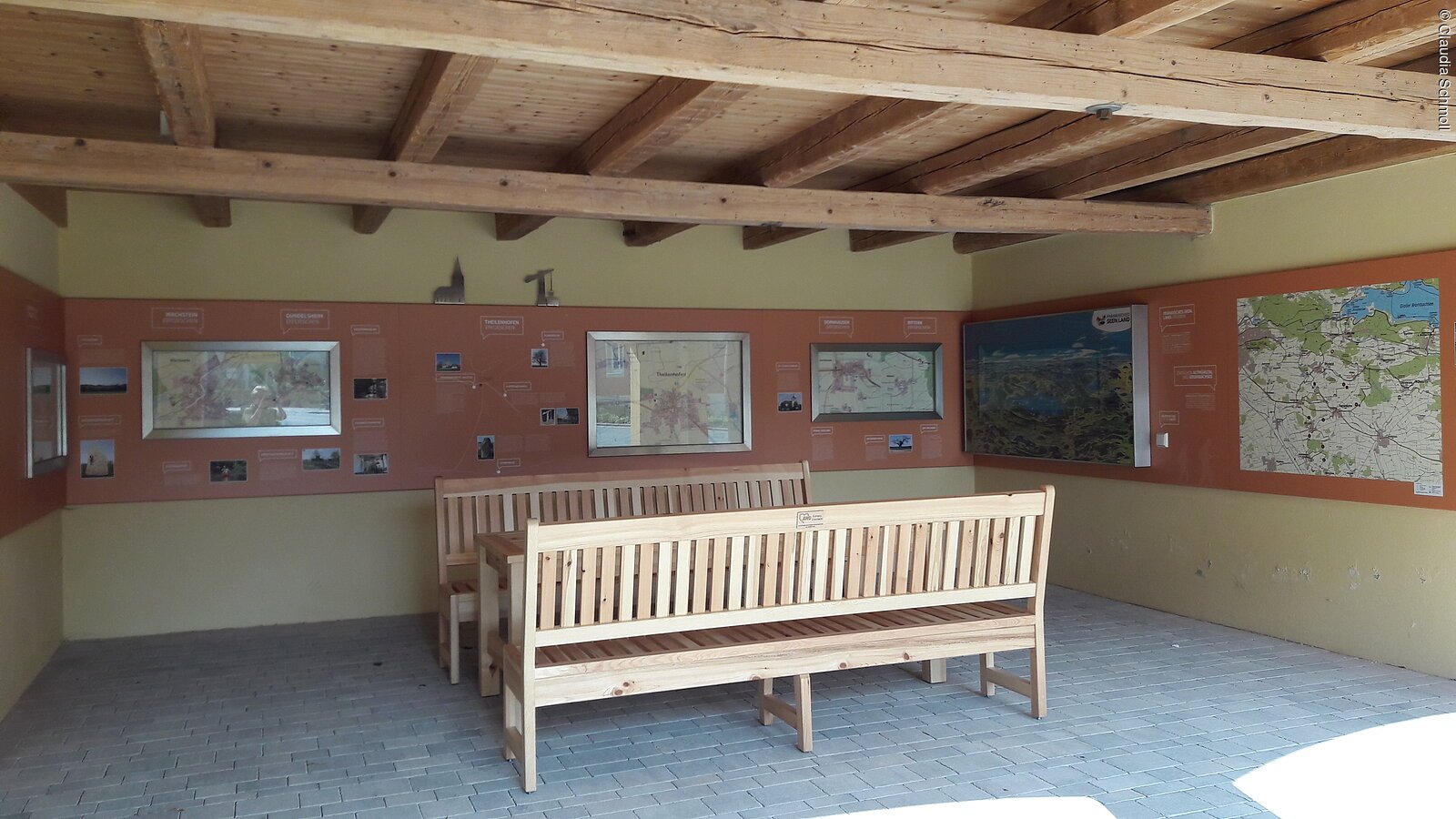 Im Außenbereich stellt sich die Gemeinde Theilenhofen mit ihren Ortsteilen und das Fränkische Seenland den Gästen vor. Eine große Sitzgarnitur lädt zum Verweilen ein.