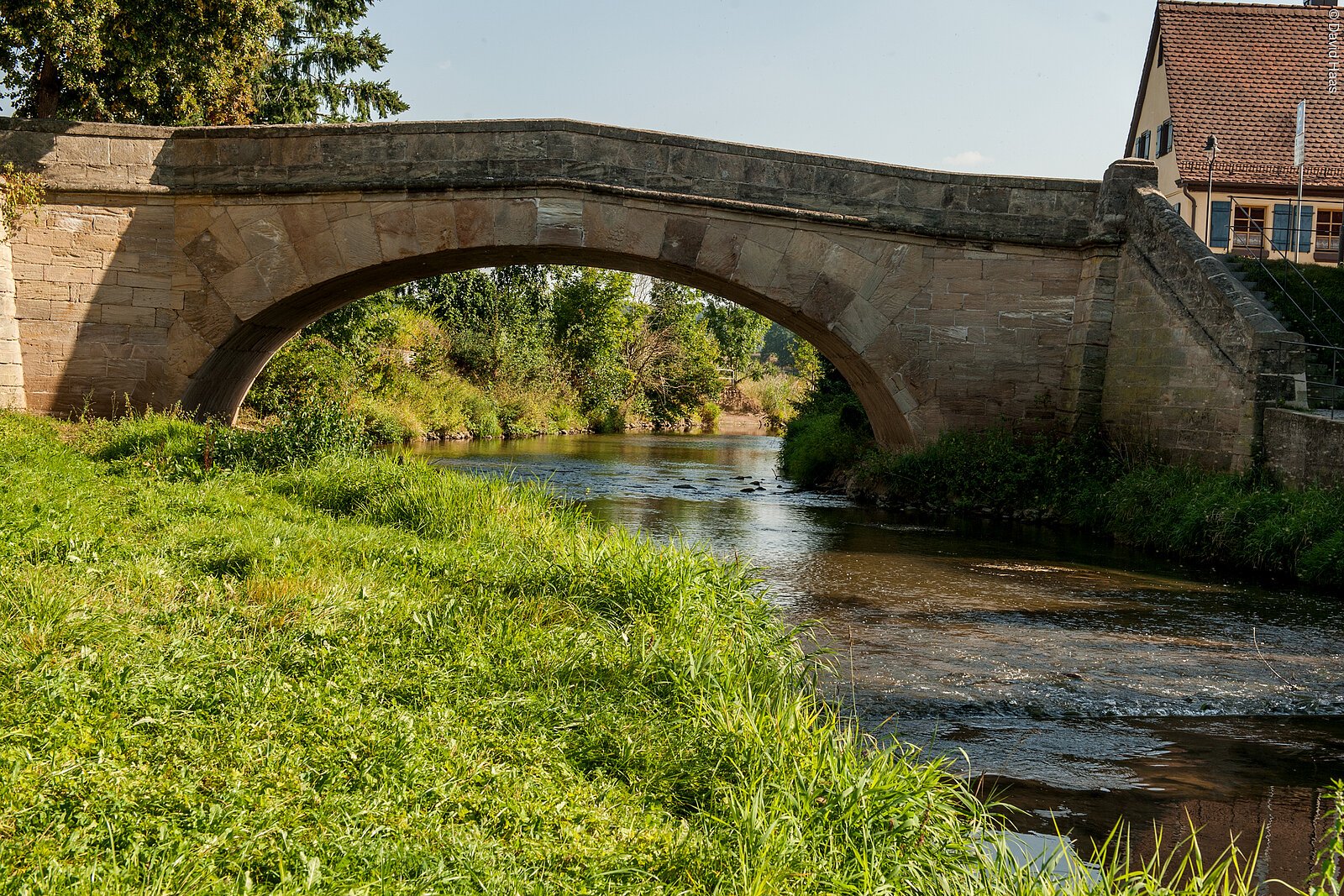 Im Jahr 1790 entschloss sich der letzte Markgraf, Karl Alexander, schließlich eine Brücke aus Stein bauen zu lassen. Die Gewölbebrücke im neuklassizistischen Stil ist das letzte Bauwerk des Markgrafen. Fertiggestellt wurde der Sandsteinquaderbau allerdings nachweislich erst 1792, als der kinderlose Margraf bereits in England weilte. Die Markgrafschaft hatte er im Jahr zuvor an Preußen verkauft.