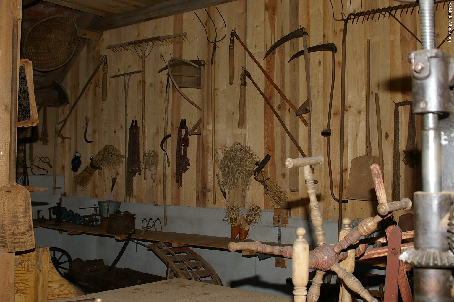 Die umfangreiche Ausstellung beinhaltet auch viele Überraschungsstücke wie z. B. eine alte Schulbank, Schiefertafel, Holzwiege, Butterfass und Nähmaschine. Die Ausstellung beinhaltet insgesamt über 350 Einzelteile.
