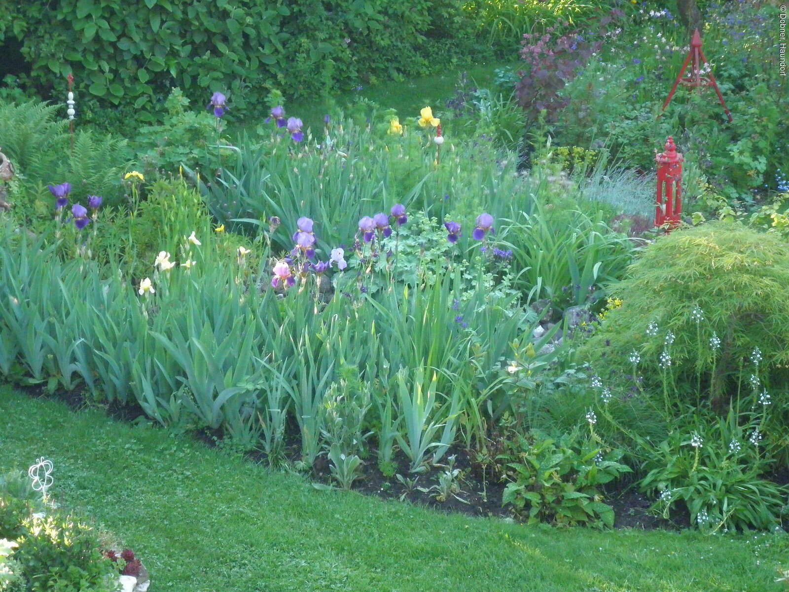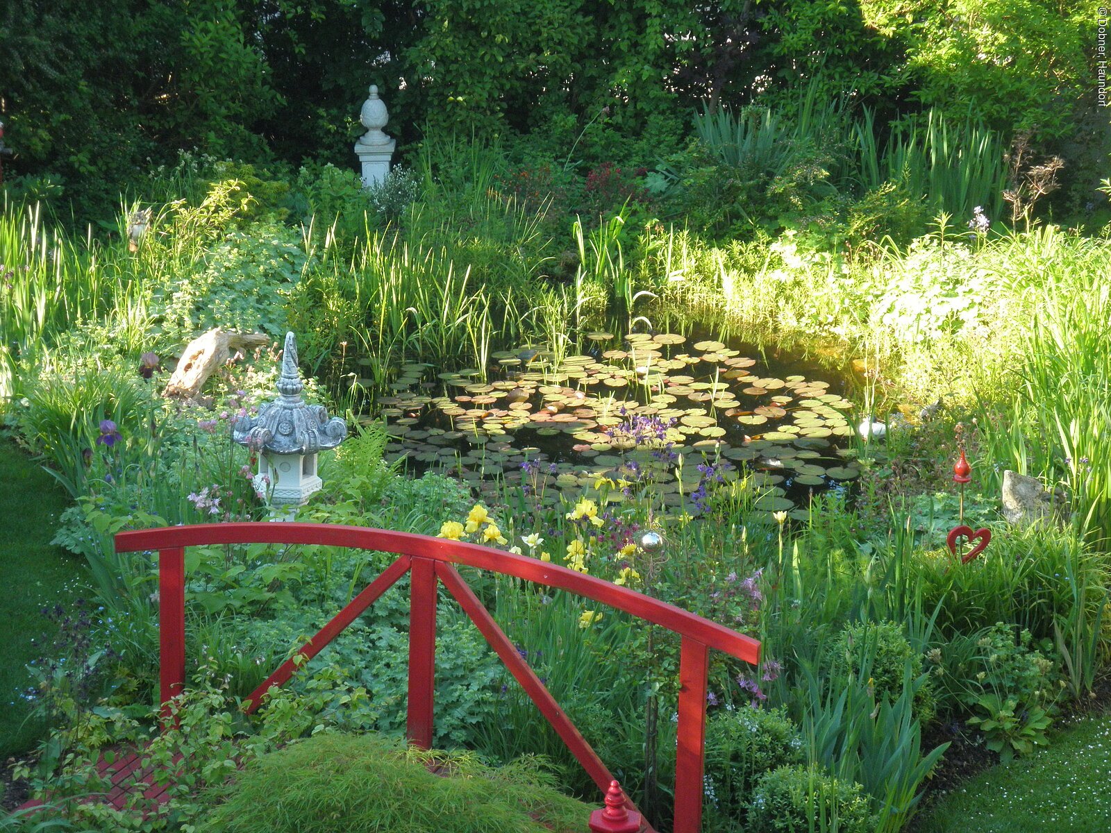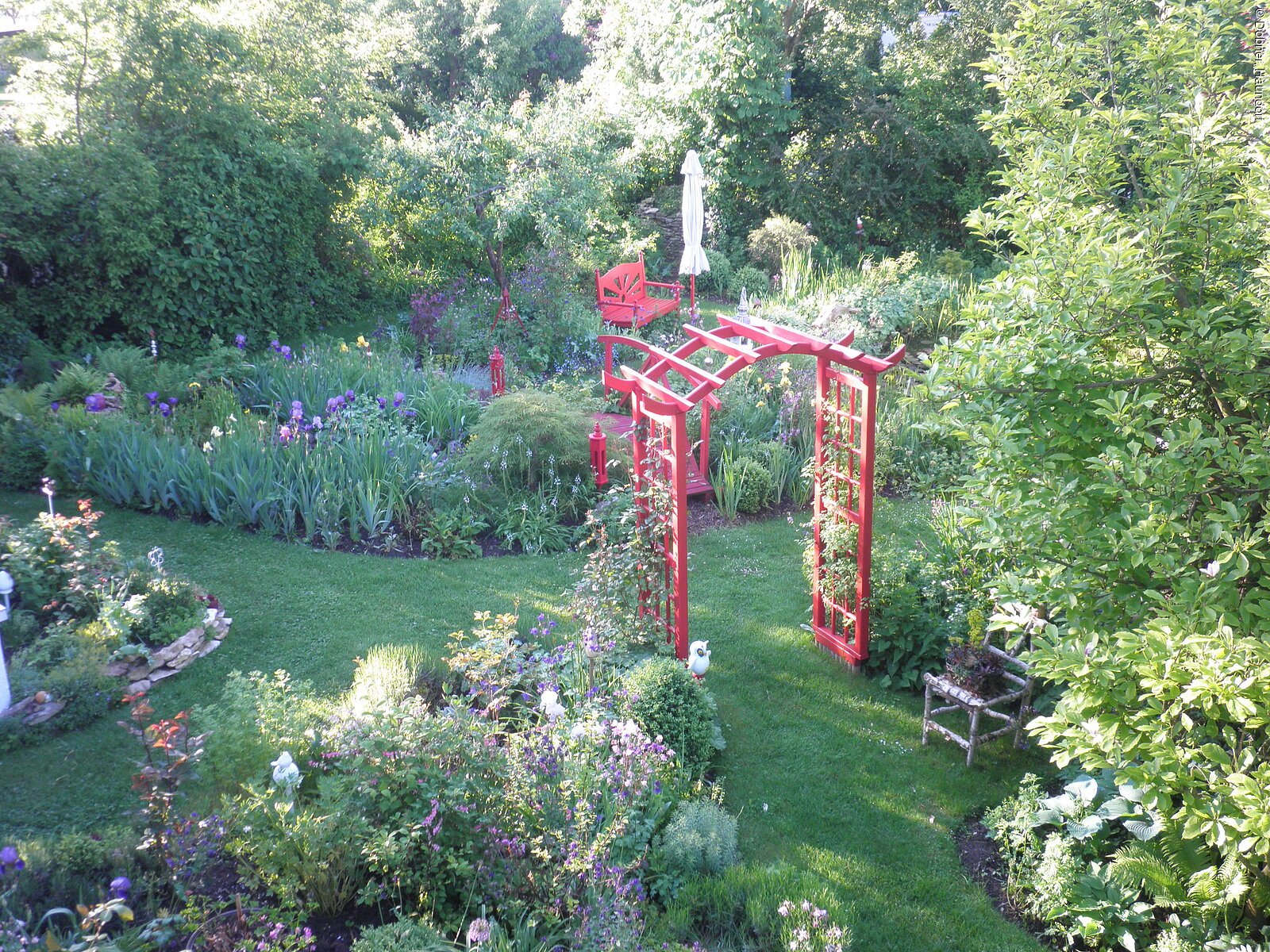 Privatgarten ca. 1200 qm groß und mit einer naturnahen Hecke umrahmt. Rosen, Clematis, Sträucher und Stauden sind in großer Vielzahl und bunter Vielfalt gepflanzt. Durch einen mit roten Rosen bepflanzten Rosenbogen betritt man den Garten. Die Treppe zum Haus ist mit Blumenbeeten eingefasst. Der Garten ist in weiße, rote und blaue Gartenräume aufgeteilt, die wiederum mit Rosenbögen in einander übergehen. Passende Pflanzen, Gartenaccessoirs und farblich abgestimmte Bänke laden zum Verweilen ein. Der Fam. Dobner ist es wichtig, dass sowohl im zeitigen Frühjahr als auch im Winter Pflanzen blühen. Ca. 50 Buchskugeln geben dem Garten zusätzlich Struktur. Viele Beete sind mit Buchshecken umgeben (ca. 200 lfdm.).