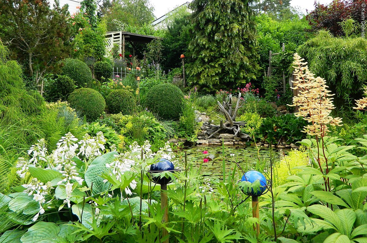 Ein romantischer Garten in Hanglage mit Bachlauf, 3 Gartenteichen und wunderschönen Stauden, Ramblerrosen, Buchskugeln, vielen Gräserarten und einer großen Funkiensammlung. Viele Kunstwerke aus alten Materialien bereichern den Garten.