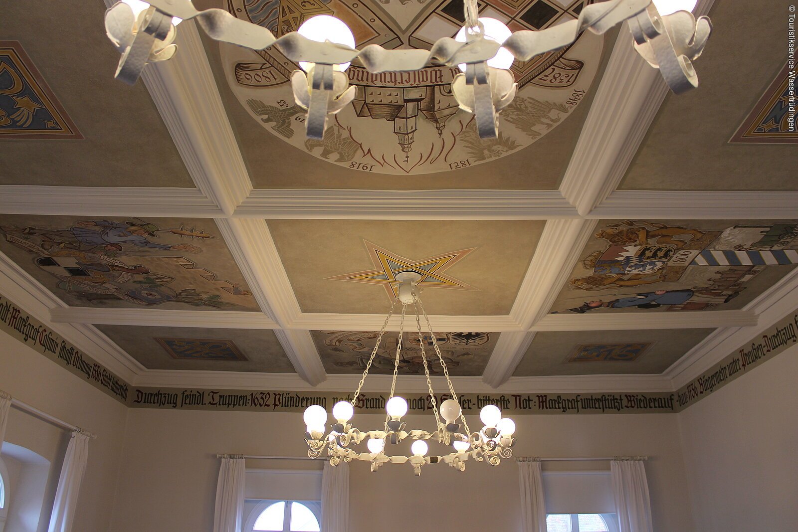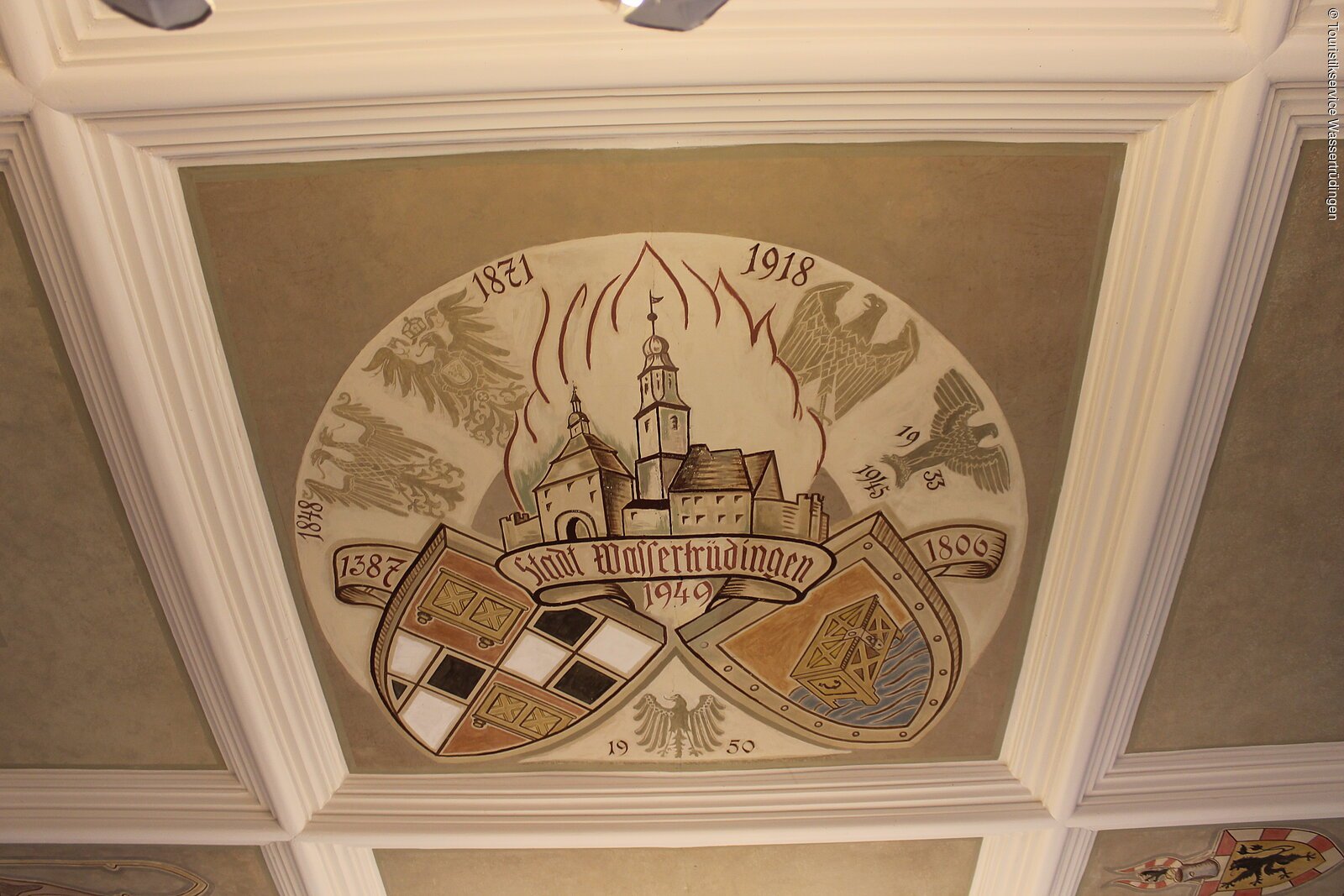 Im 1849/50 erbauten Rathaus der Stadt Wassertrüdingen befindet sich im Obergeschloss der große Sitzungssaal. Dort kann die, in der Region einzigartige, Stuck-Kassettendecke mit der Darstellung der Stadtgeschichte bewundert werden. Eine Besichtigung ist nach Voranmeldung möglich.
