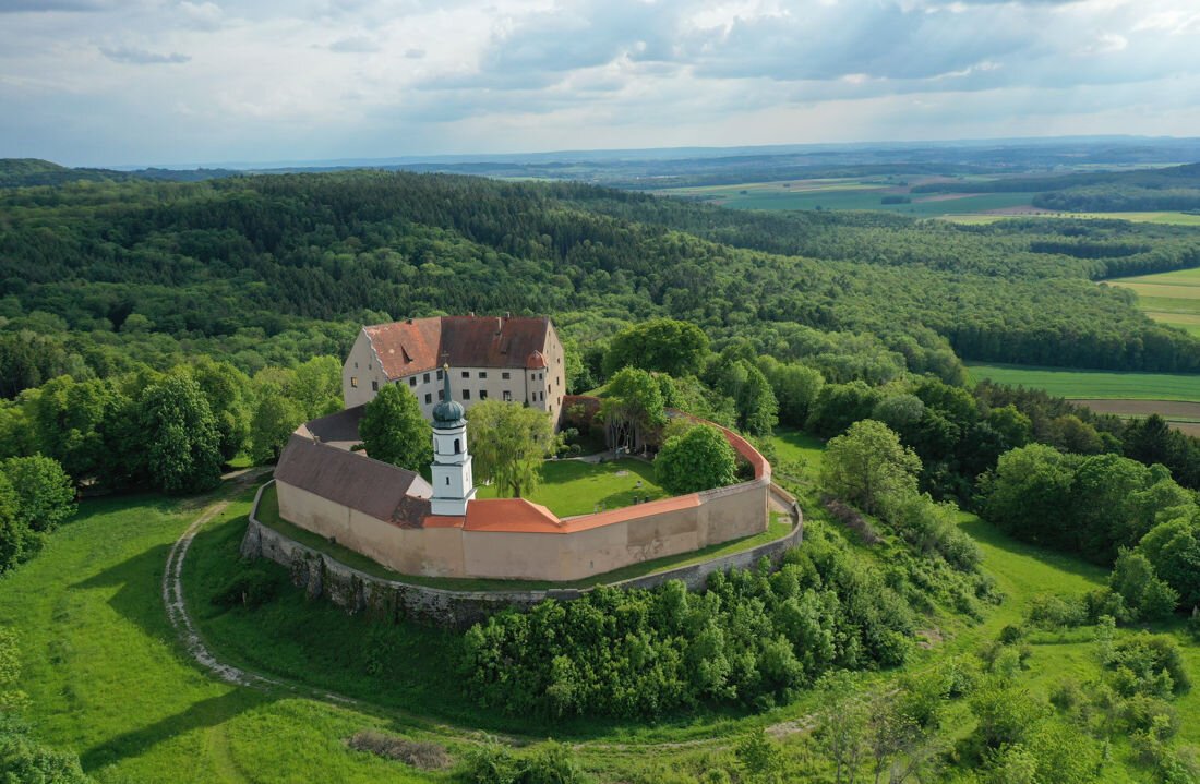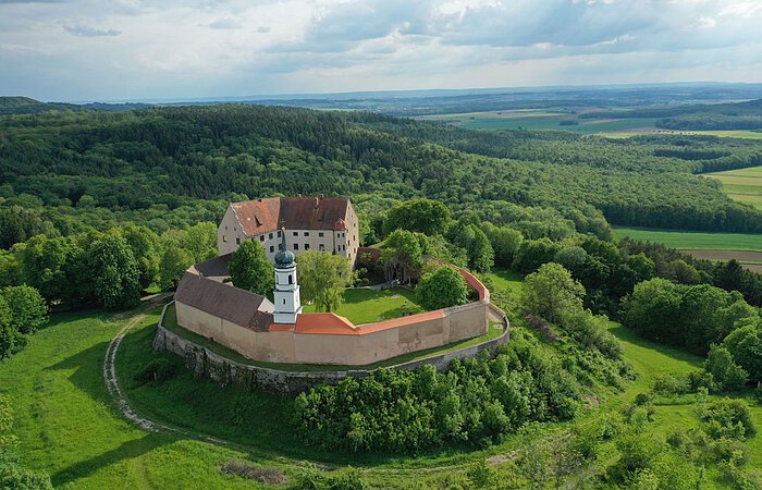 Etwa 10 km südwestlich von Gunzenhausen, nahe der B466 gelegen, thront auf einer vorgeschobenen Zunge des "Hahnenkamm" das weithin sichtbare Schloss Spielberg,