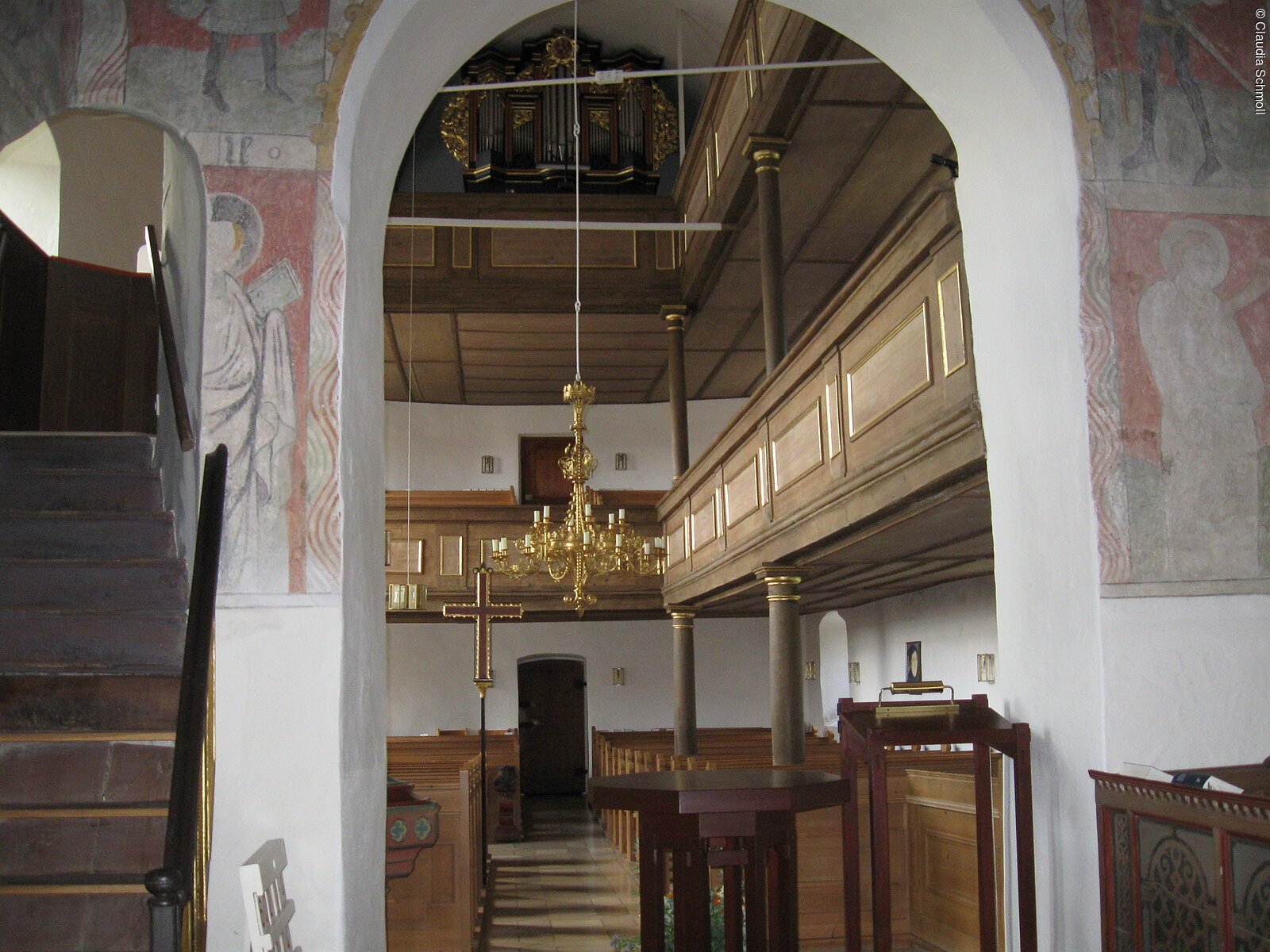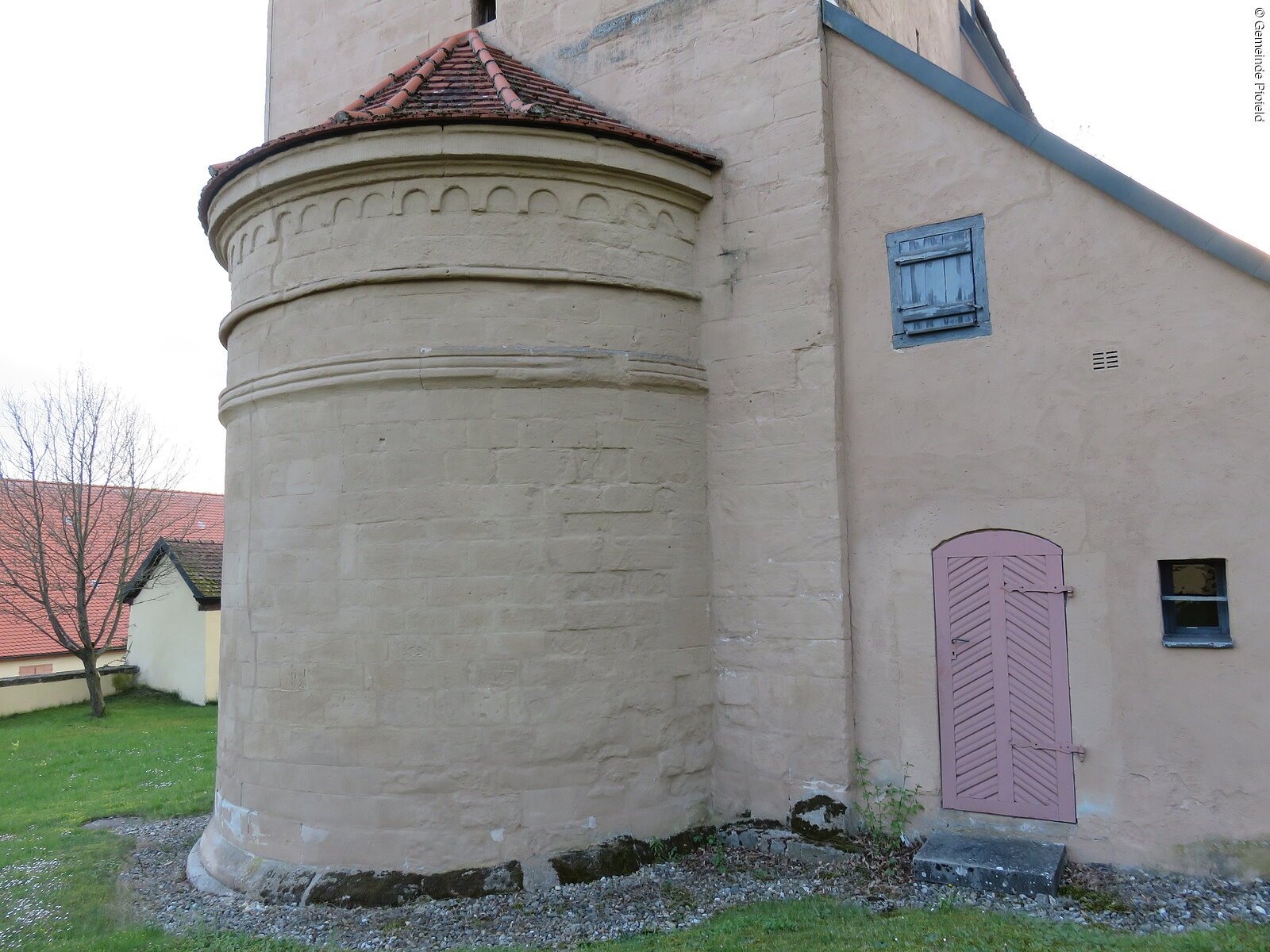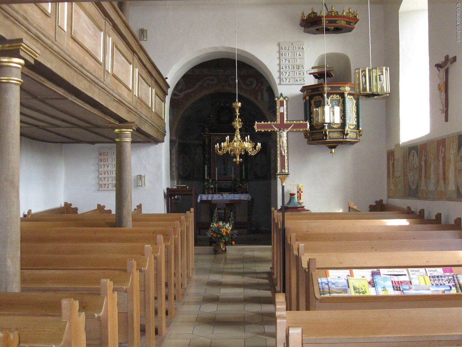 Betritt man die Kirche, fällt zuerst der Hauptaltar ins Auge. Er ist vom Wappen des Ansbacher Markgrafen Carl Wilhelm Friedrich geziert. Eine Besonderheit sind die gotischen Fresken im Altarraum und im Kirchenschiff aus dem 15. Jahrhundert, die erst nach dem zweiten Weltkrieg wieder freigelegt wurden. Auffällig sind auch die massive Mauer und die schlitzartigen Fenster, die darauf hindeuten, dass das Gebäude einst als Wehrkirche diente.