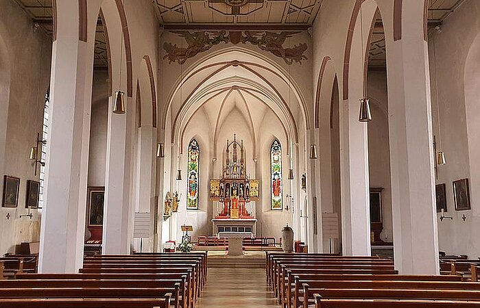 Der neugotische Hauptaltar wurde wahrscheinlich von einem gewissen Meister Weiß aus Landshut gefertigt. Das Bild des Hauptaltares - die Kreuzigung Christi - war die letzte Arbeit des verstorbenen Professors Schlotthauer aus München. Die beiden Seiten des Altares zierten die Statuen von Willibald und Walburga. An den Wandflächen oberhalb des Eingangs zum Presbyterium befanden sich die Bildnisse der Apostel Petrus und Paulus. Die Bilder der beiden Seitenaltäre stellen die Krönung Mariens und die Heilige Familie (Anna Selbdritt) dar und sind etwa um 1510 entstanden.