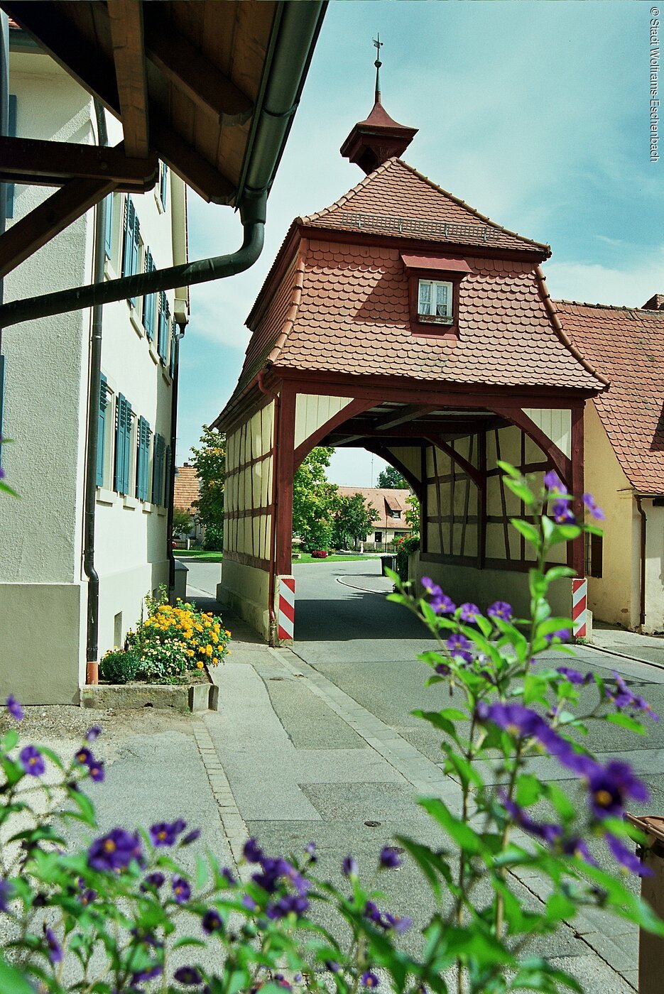 Das Mansardendach wird von einem Glockenständer gekrönt. Der Zugang zu den Zimmern über dem Tor erfolgt über eine Außentreppe und ist heute unbewohnt.
