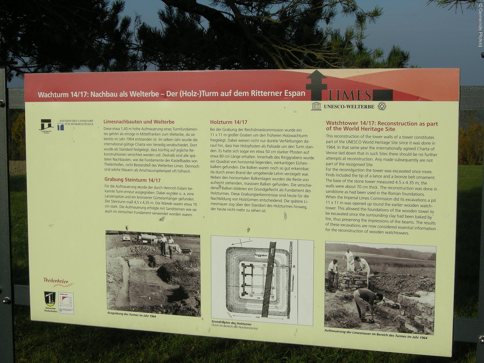 Aus der Untersuchung der Turmstelle von Dr. H. Eidam kennt man den Standort eines "Blockhauses" (Holzturm) mit massiver Fundamentkonstruktion aus Holz, der sich nach den Grabungsergebnissen westlich vom Steinturm befindet. Ferner sind die Lage der Limesmauer und der nördlich an der Turmstelle im Feld vorbeilaufende Palisadengraben bekannt. Heute ist am Standort von Wp. 14/17 nur der Grundriss des Steinturms ca. 1 m hoch rekonstruiert. Die Reste des "Blockhauses" dagegen sind, wie auch Spuren von Limesmauer oder Palisadengraben vor Ort nicht sichtbar.