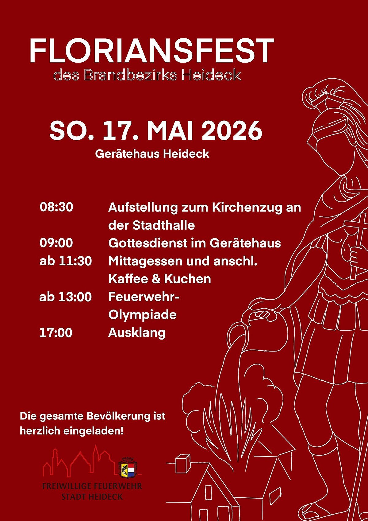 Das Floriansfest des Brandbezirks Heideck wird 2026 von der Stützpunktfeuerwehr Heideck ausgetragen. Hierzu sind alle Feuerwehren des Brandbezirks sowie die gesamte Bevölkerung herzlich eingeladen.
