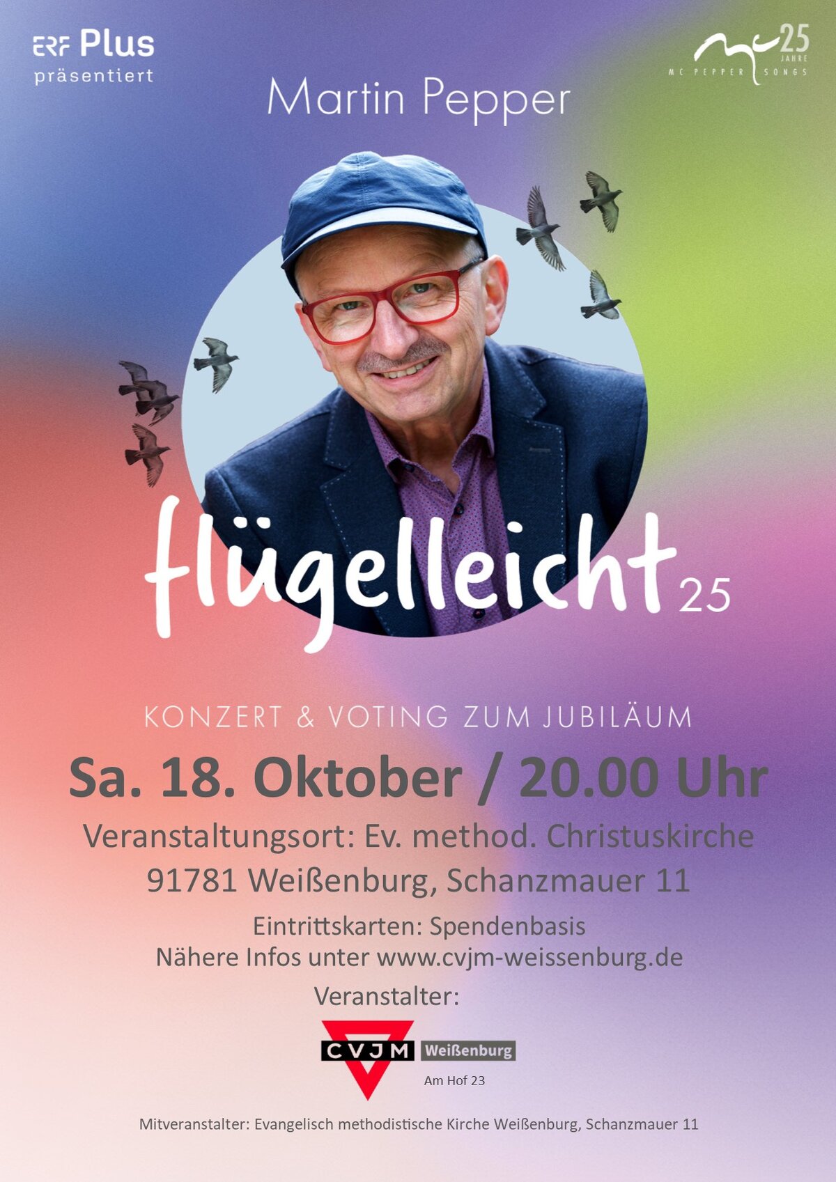 Zum 25-jährigen Jubiläum seines Musikverlages mc-peppersongs präsentiert er im Rahmen der „Flügelleicht 25“-Tour seine neue CD. Im Konzert werden alle 20 neuen Lieder zu hören sein. Die Songs laden dazu ein die Botschaft des christlichen Glaubens mit Sinn und Seele zu erleben. Am Ende des Abends gibt es ein Voting bei dem die Zuhörer ihre Wertung einbringen können. Die besten Songs werden dann in einem Jubiläumsalbum in erweiterter Länge und mit voller Bandbesetzung eingespielt.Ein großes Anliegen ist es dem Künstler, das gemeinsam gewachsene Lebenswerk mit seiner im letzten Jahr verstorbenen Frau Claudia Pepper zu ehren. Darüber hinaus geht es ihm darum neue ermutigende Glaubensimpulse in Zeiten von Krisen und persönlichen Verlusterfahrungen zu setzen.