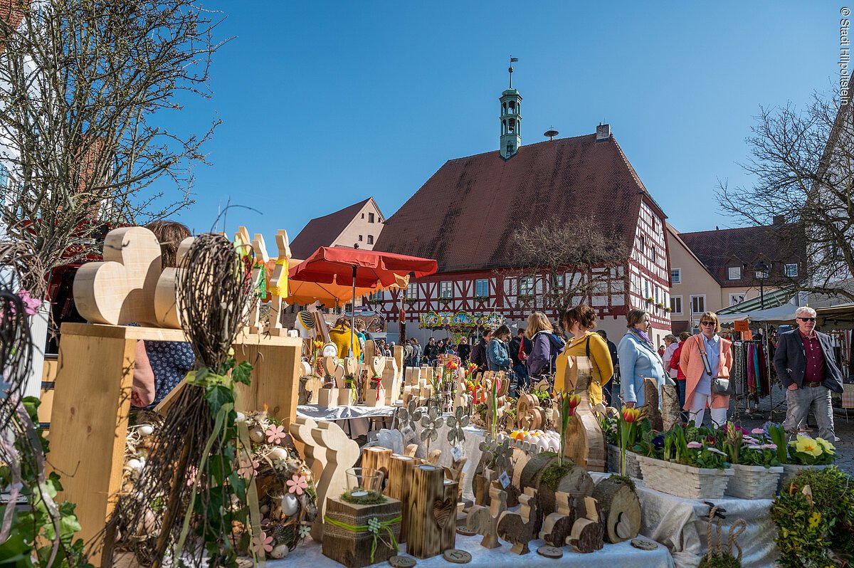 Der Ostermarkt lockt wieder auf einen Besuch in die Hilpoltsteiner Innenstadt. In der historischen Altstadt laden viele Marktstände zum Bummeln und Flanieren ein. Ein buntes Rahmenprogramm begleitet den Markttag. Bei der Eröffnung des Osterbrunnens am Rathaus wirken die Grundschule, die Tanzschule Pietzner und die Stadtkapelle Hilpoltstein mit. Zum Autofrühling im Gewerbegebiet „Am Kränzleinsberg“ präsentieren die Händler Neuigkeiten rund ums Automobil. Für ein farbenfrohes Ambiente im gemütlichen Treiben sorgen auch die Gastronomie und die Geschäfte am verkaufsoffenen Sonntag.
