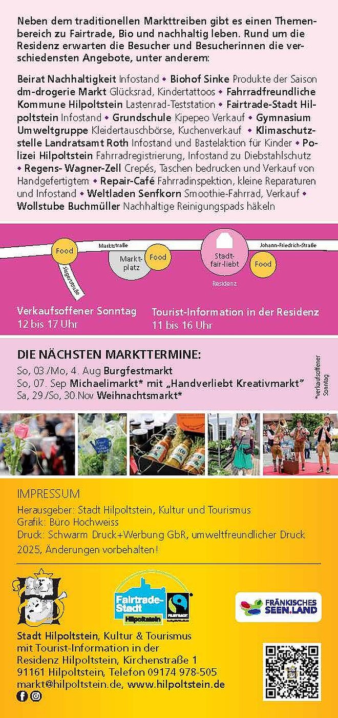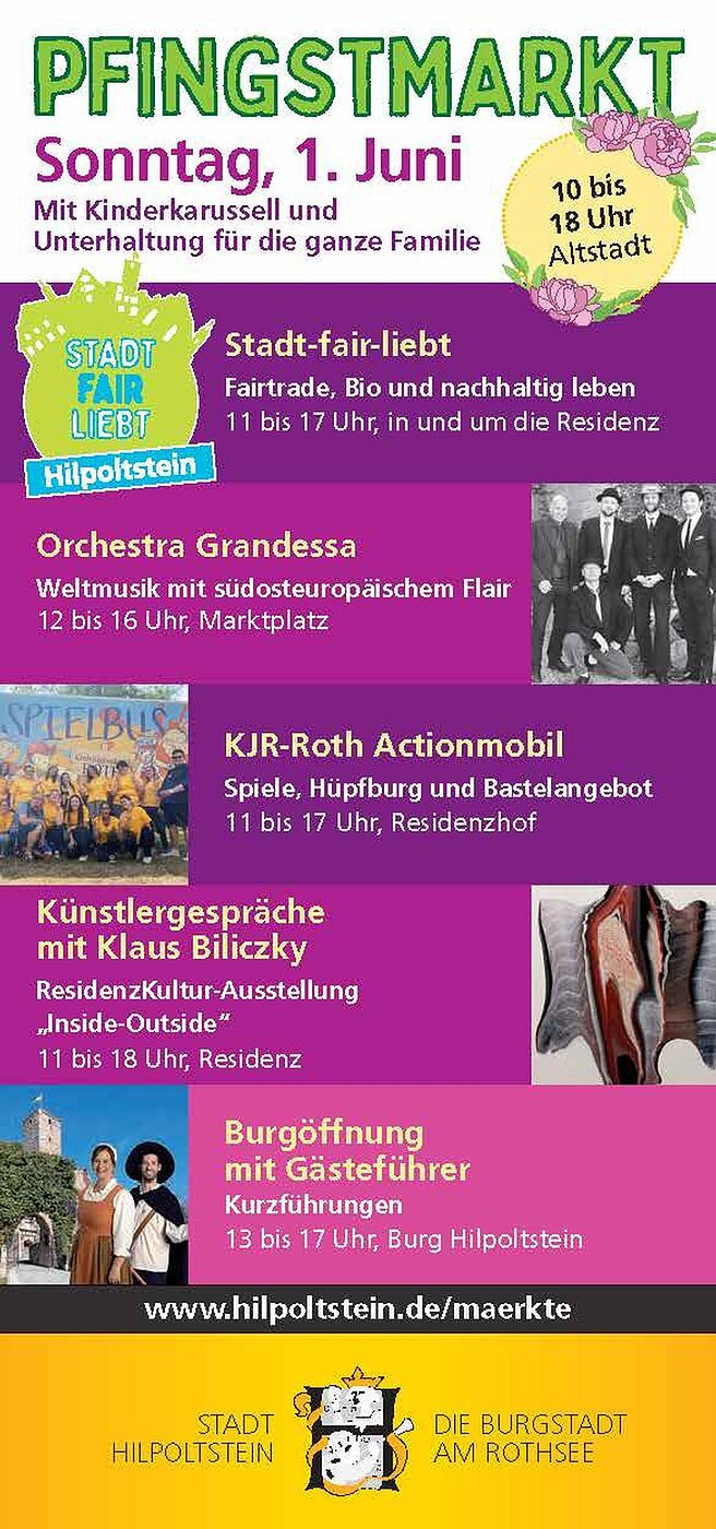 In Hilpoltstein lädt der traditionelle Pfingstmarkt zum entspannten Flanieren, Stöbern und Genießen ein. Entlang der Marktstraße erwartet Besucherinnen und Besucher ein vielfältiges Angebot: Von regionalen Spezialitäten über Kunsthandwerk bis hin zu Kinderaktionen und Livemusik ist für alle etwas dabei. Ein besonderes Highlight ist der Teilmarkt „Stadt-fair-liebt“ rund um die Residenz – mit inspirierenden Ideen rund um Nachhaltigkeit, Fairtrade und umweltbewusstes Leben. Für Kinder gibt es Spaß, Spiel und kreative Mitmachangebote. Wer sich kulinarisch stärken möchte, findet auf dem gesamten Markt leckere Speisen und Getränke.