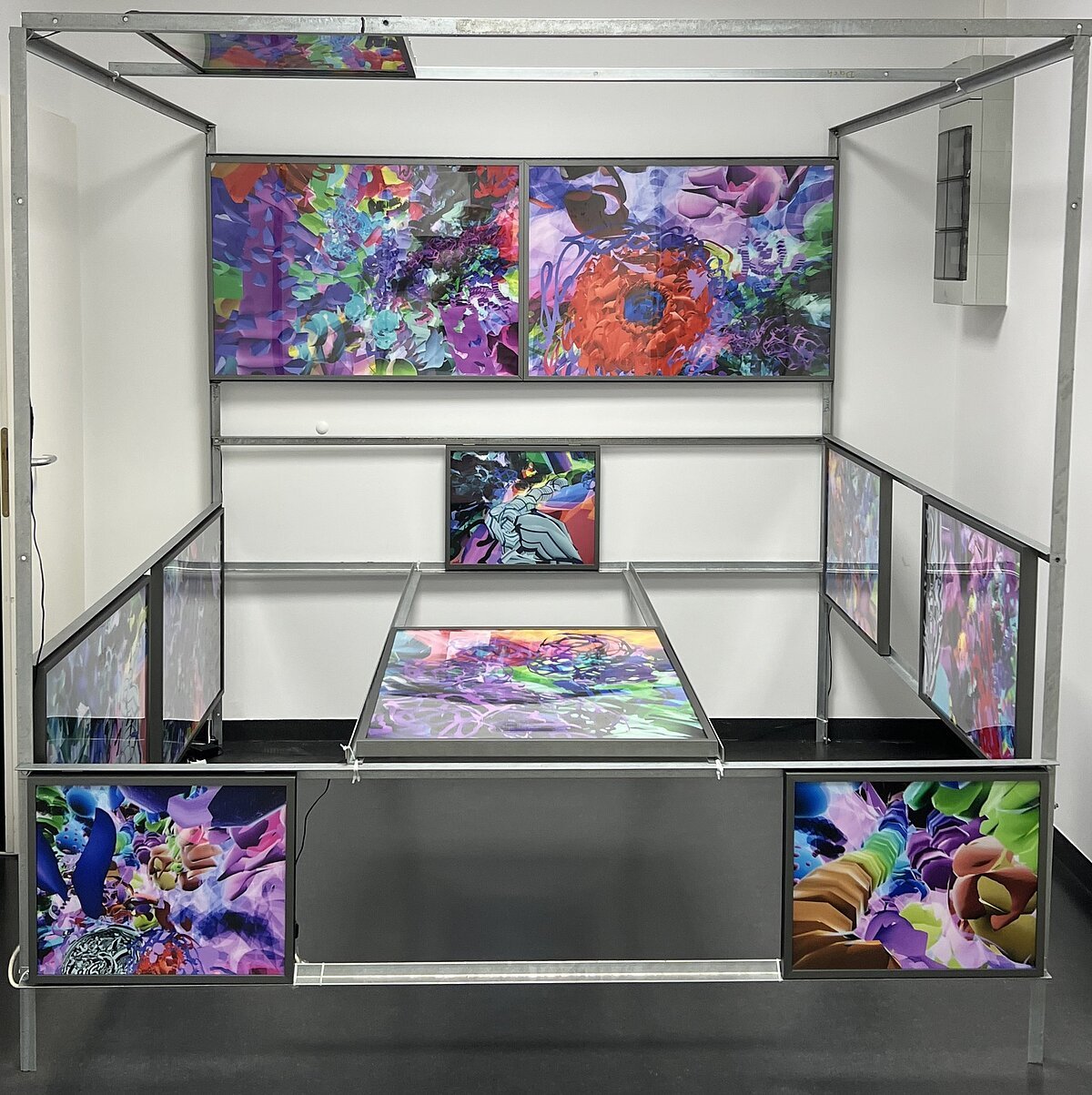In „QUANTENRAUSCH“ verbindet Klaus Haas virtuelle Malerei, abstrakte Bildwelten und räumliche Setzungen zu einer hybriden, immersiven Erfahrung. Digitale Malerei wird nicht als reine Bildschirmästhetik verstanden, sondern als sinnlich wahrnehmbare Erweiterung von Malerei, Installation und öffentlichem Raum. Die Arbeiten bewegen sich zwischen Präzision und Kontrollverlust, zwischen technischer Gegenwart und poetischer Verdichtung – als künstlerische Untersuchung von Wahrnehmung, Realität und Transformation im digitalen Zeitalter.