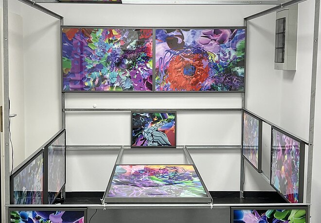 In „QUANTENRAUSCH“ verbindet Klaus Haas virtuelle Malerei, abstrakte Bildwelten und räumliche Setzungen zu einer hybriden, immersiven Erfahrung. Digitale Malerei wird nicht als reine Bildschirmästhetik verstanden, sondern als sinnlich wahrnehmbare Erweiterung von Malerei, Installation und öffentlichem Raum. Die Arbeiten bewegen sich zwischen Präzision und Kontrollverlust, zwischen technischer Gegenwart und poetischer Verdichtung – als künstlerische Untersuchung von Wahrnehmung, Realität und Transformation im digitalen Zeitalter.