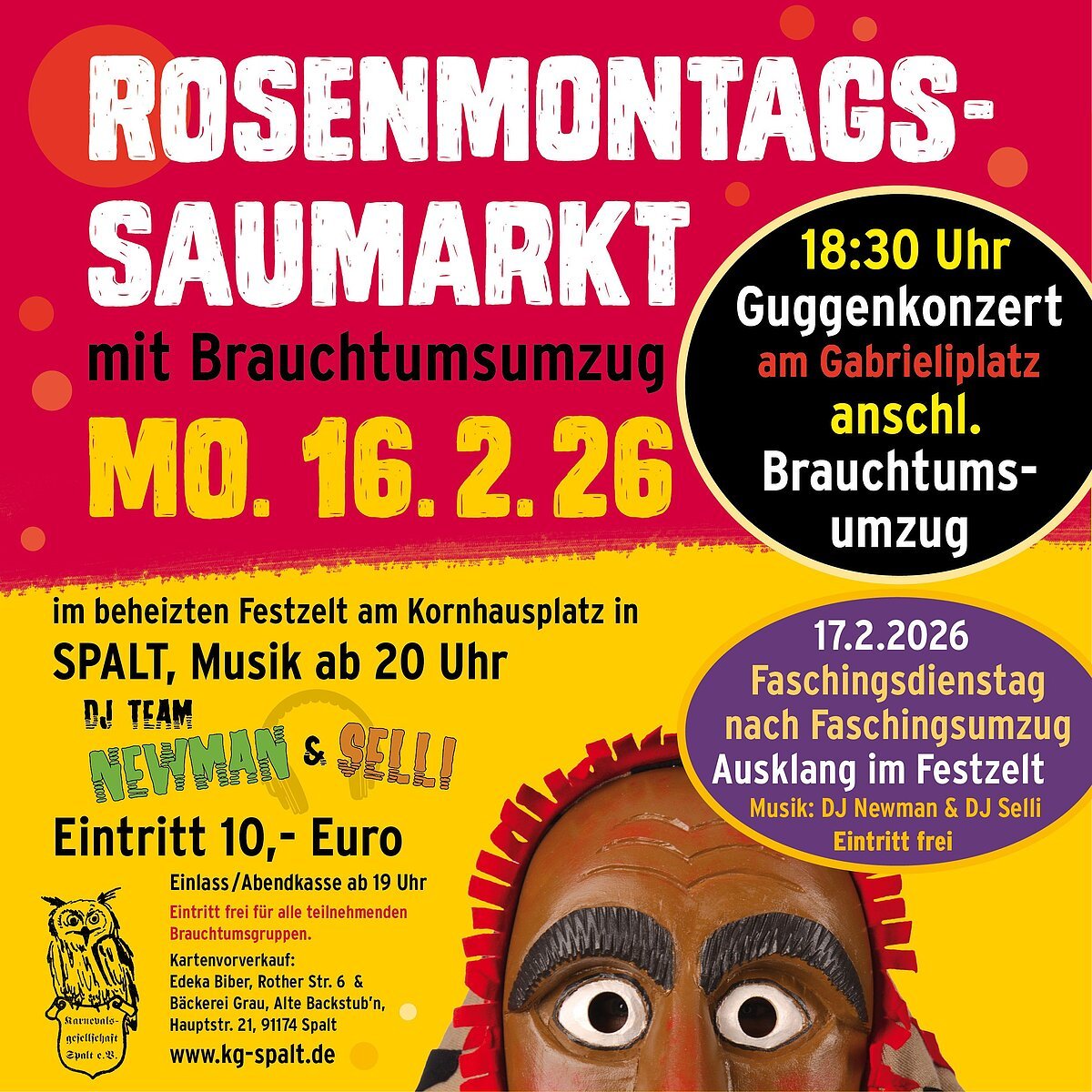 Am Rosenmontag erwartet Sie um 18:30 Uhr ein Guggenkonzert am Gabrieliplatz mit anschließenden Brauchtums-Umzug durch die Altstadt (Stiftgasse, Herrengasse, Gabrieliplatz). Dieser verläuft durch die historische Altstadt und endet am Kornhausplatz mit dem Einzug zum Rosenmontag-Saumarkt-Ball im beheizten Festzelt mit „DJ-Team Newman & Selli“.