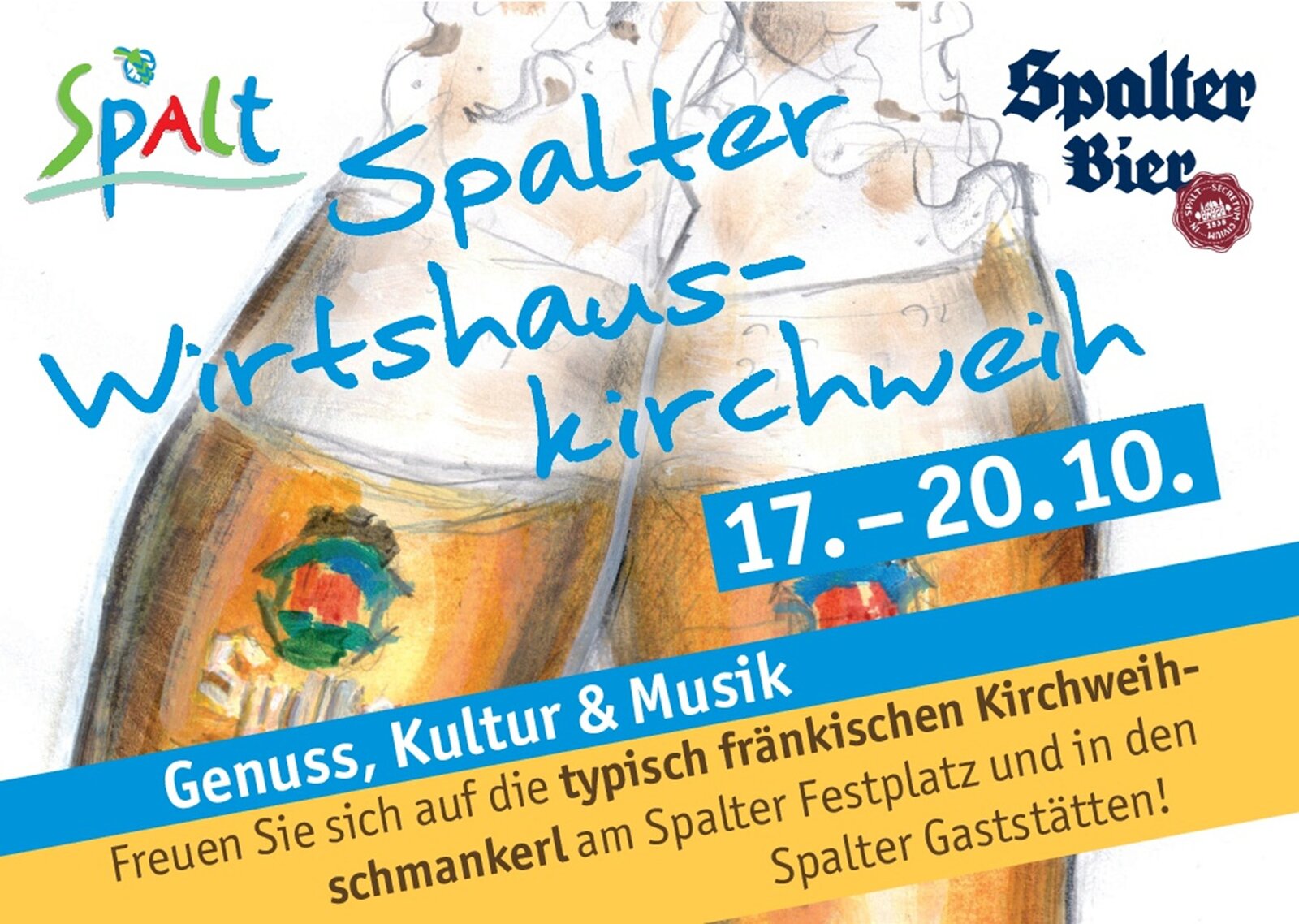 Die Spalter Wirtshauskirchweih lockt wieder mit einem bunten und genussvollen Programm in die Hopfen- und Bierstadt Spalt. Traditioneller Start im Bayerischen Hof am Freitag Mittag: Schlachtschüssel & Geräucherte, an allen Tagen: Bayerische Burger. Im Wittelsbacher Hof erhalten Sie das ganze Kirchweihwochenende, Fisch- & Wildgerichte sowie fränkische Spezialitäten. Der Gasthof Krone lockt ebenso mit fränkischen Spezialitäten an allen Tagen. Im Wirtshaus Lang Marie: Freitag Schaschlik, Sonntag Mittagstisch und Montag ab 17 Uhr mit Kerwamusik.