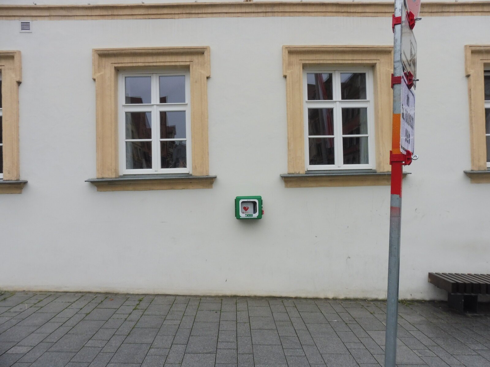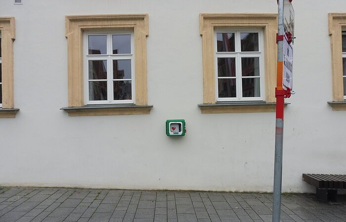 Defibrillator an der Hauswand rechts neben der Eingangstür vom Marktplatz aus