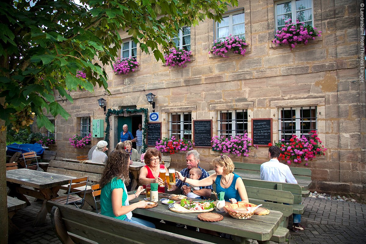 Wer nun nach den 13 km Durst und Hunger bekommen hat, für den ist in der Fuchsmühle mit dem herrlichen Biergarten bestens gesorgt. Hier kann man sich mit fränkischen Spezialitäten verwöhnen lassen.