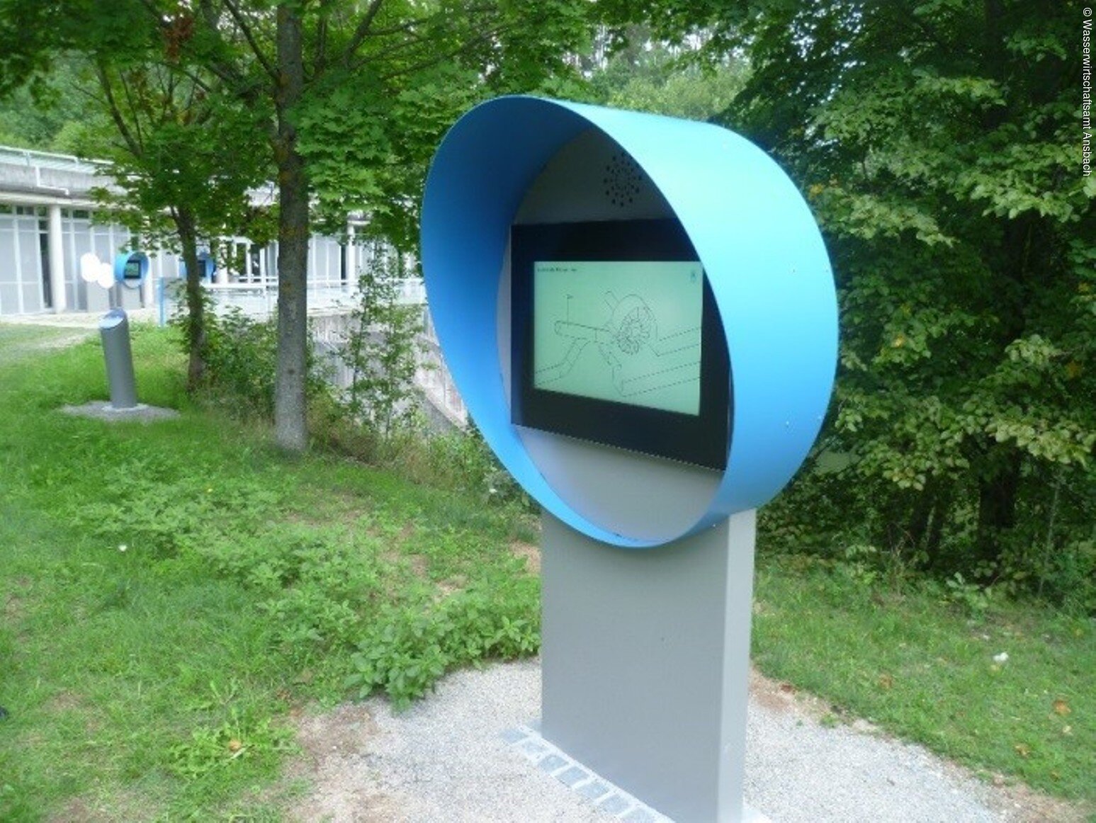 Wandert man in Richtung Krafthaus Brombachsee, kann man sich an verschiedenen Monitorstationen und Infotafeln über die gegenwärtige konventionelle Wasserkrafttechnik informieren.