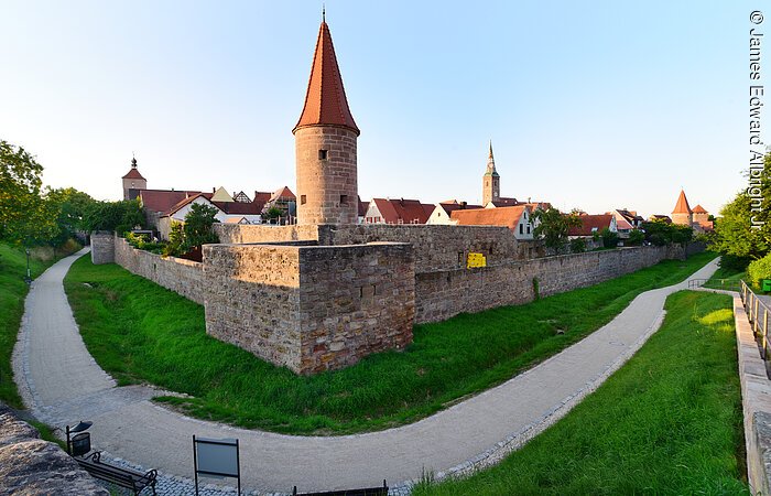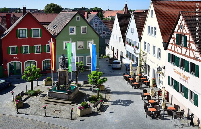Die Radler verlassen die historische Altstadt von Wolframs-Eschenbach auf der Richard-Wagner-Straße Richtung Süden. Am Kreisverkehr nehmen sie die rechte Abzweigung. Der Radweg folgt der Staatsstraße 2220 Richtung Merkendorf. In der historischen Krautstadt geht es links ab auf die Hauptstraße. Der Weg führt vorbei am Merkendorfer Rathaus aus dem 15. Jahrhundert und dem Krautbrunnen. Auf der Hauptstraße geht es weiter bis zur Querung der Bundesstraße 13 (Gunzenhausener Straße). Danach wendet man sich nach rechts und radelt einen kurzen Abschnitt neben der B 13, bevor der Weg leicht nach links abbiegt. Der Bahnhof Triesdorf liegt auf der Strecke, dann ist nach einem kurzen Stück durch den Wald die Straße in den Ort Triesdorf erreicht. Auf der Markgrafenstraße radelt man vorbei am Bildungszentrum Triesdorf. Die Straße wird zur Triesdorfer Straße, die weiter nach Weidenbach führt. Am Marktplatz biegen die Radler rechts ab in die Bechhofener Straße. Auf dem Radweg an der Staatsstraße 2220 geht es zwischen Feldern und Wiesen weiter bis zu einer Abzweigung nach rechts Richtung Sommersdorf. Im Ort biegen die Radler links ab, fahren in südlicher Richtung nach Kleinried und überqueren kurz darauf die Altmühl. Auf der Goethestraße geht es durch Großenried. Bald hinter dem Dorf biegt der Radweg leicht rechts in ein Waldstück ein, hinter dem schon die ersten Häuser von Bechhofen an der Heide zu sehen sind. Die Ansbacher Straße führt durch den Ort, bis sie nach einem Kreisverkehr in die Dinkelsbühler Straße übergeht.