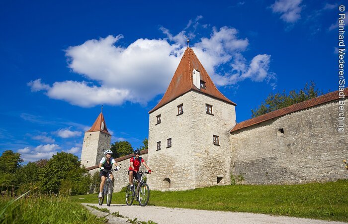 Vor Berching überqueren die Radler den Kanal und biegen gleich darauf nach links in den Schwimmbadweg ein, der in die Bahnhofstraße mündet. Dieser folgen sie bis zur Johannesbrücke, wo sie sich nach rechts wenden. Über die Sulz geht es in die historische Altstadt, die von einer vollständig erhaltenen Stadtmauer umrahmt wird. Der Pettenkoferplatz mit der hellblauen Fassade des Rathauses und der Reichenauplatz werden überquert, bevor man zur Uferpromenade am Main-Donau-Kanal gelangt. Nun sind die Radler entlang dieser