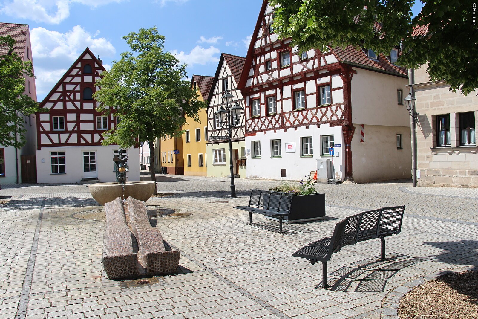 Fränkischen Seenland bildet. An ihrem Ende biegen sie links auf die Laffenauer Straße ein und nehmen am Kreisverkehr mit dem auffälligen Vogel Strauß, einem Kunstwerk aus Edelstahl, die erste Abzweigung auf die Hauptstraße. Am Marktplatz sind die schmucken Fachwerkhäuser ein Blickfang. Auf der Rambacher Straße verlassen die Radler die Stadt, nehmen an der Kreuzung die rechte Abzweigung und radeln bald an der Kleinen Roth entlang.