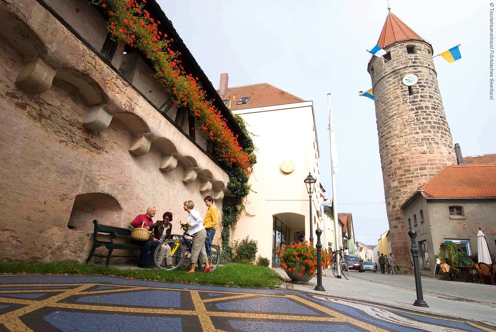 Vielfältige Wasserlandschaften liegen bei der vierten Etappe des Fränkischen WasserRadwegs auf der Strecke. Die Radler verlassen Pleinfeld entlang der Schwäbischen Rezat auf dem Lauterbrunnenweg, überqueren den Banzerbach und biegen gleich darauf rechts ab. Über den Weiler St. Veit gelangen sie rasch nach Ramsberg. Kaum haben sie den Ort hinter sich gelassen, liegt die tiefblaue Wasserfläche des Großen Brombachsees vor ihnen.