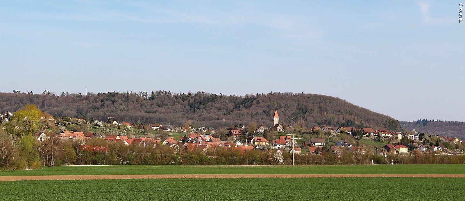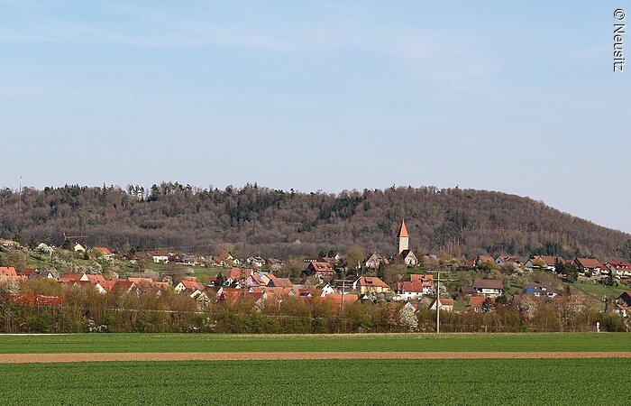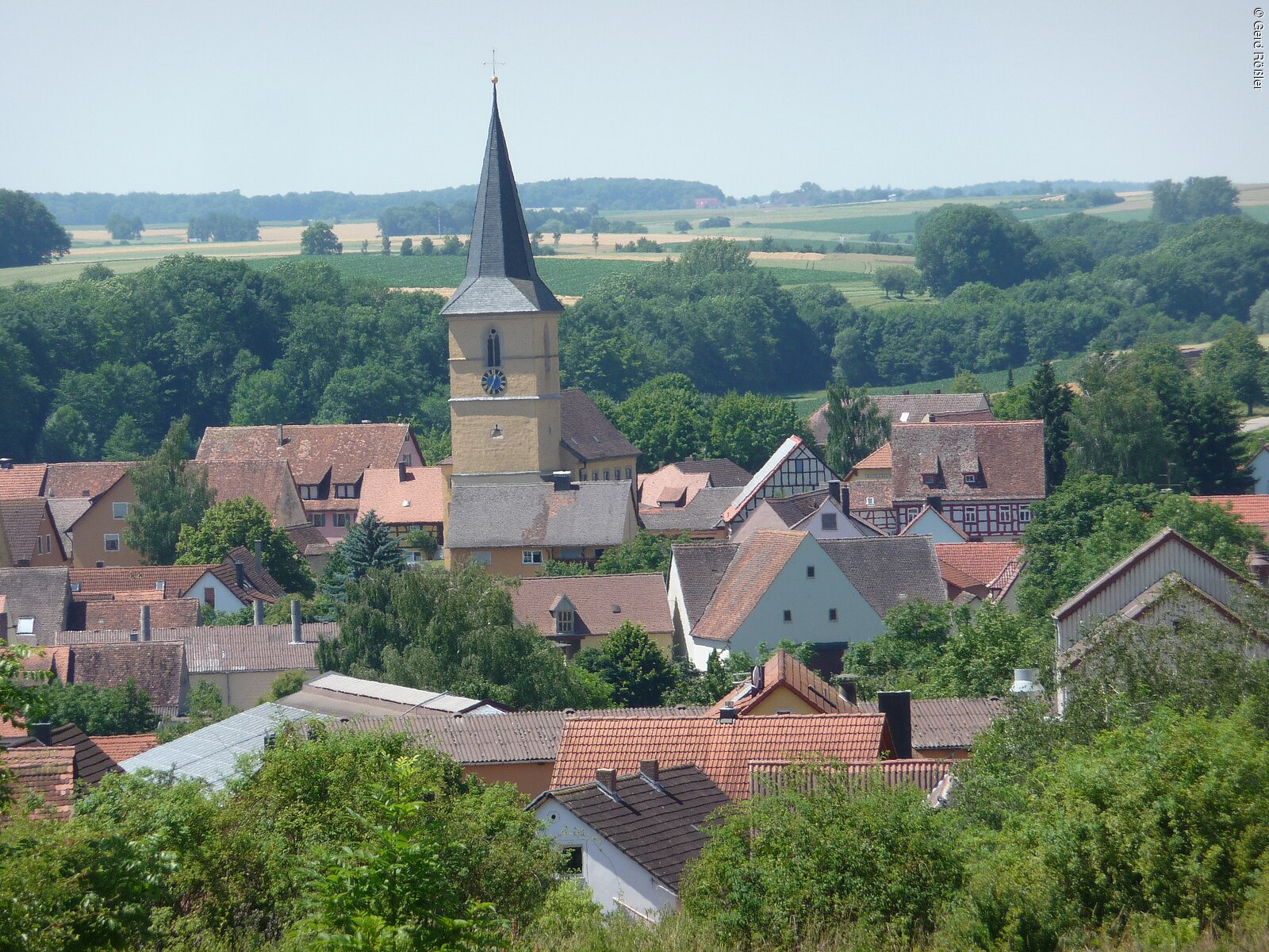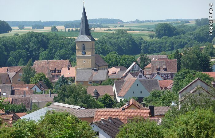 die Radler über Diebach nach Gebsattel, das umgeben von Feldern und Wiesen schon von Weitem zu sehen ist.