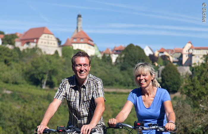 Mittelaltercharme und Rokokopracht prägen die sechste Etappe des Fränkischen WasserRadwegs, die in Schillingsfürst zu Füßen des prächtigen Barockschlosses mit Museum und Jagdfalkenhof startet. Die Frankenheimer Straße führt zur Wörnitzquelle. Hier biegt man rechts ab ins Hirtengäßchen und verlässt anschließend die Stadt. Der Weg führt durch ein Waldgebiet. Bergab geht es nach Oberoestheim mit seinen liebevoll renovierten Fachwerkhäusern und über Unteroestheim an die Tauber. Der Radweg folgt nun dem Verlauf der stillgelegten Bahnstrecke zwischen Schillingsfürst und Rothenburg o.d.T. Die Tauber begleitet