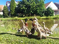 Start ist am Rathaus Unterschwaningen (Parkmöglichkeiten in der Friederike-Luise Allee). Nach Verlassen des Rathaushofes nach rechts und nach etwa 150 m links in den Straßenzug „Im Hirtenfeld“ einbiegen. Entlang dieser Straße gelangt man zum Fußweg entlang des Sportgeländes. Nach Überqueren des Baches nach links, entlang einer Lindenallee und vorbei am ehemaligen markgräflichen Kanal bis zur Nelkenstraße. Leicht bergauf links abbiegen auf den landwirtschaftlichen Wirtschaftsweg nach Kröttenbach. Auf der Anhöhe mit herrlichem Panoramablick zum Hesselberg und Hahnenkamm. Dann bergab und vor der Bahnunterführung nach links. Entlang der Eisenbahnstrecke (ehemalige Ludwig-Süd-Nord-Bahn). Beim Bahnübergang nach links dem Wirtschaftsweg und beim weiterwandern der Ausschilderung folgen. Bergab und leicht bergauf erreichen wir die Anhöhe und den Flugplatz. Geradeaus geht es weiter bis Oberschwaningen. Hier kann eine Rast im Gasthaus zur Rose eingelegt werden. In nördlicher Richtung verlassen wir den Ort und streben dem Wald zu. Von Westen grüßt der Hesselberg herüber und am Beginn des Waldes steht ein Insektenhotel. Durch den Wald bergab, dann links zum Dennenloher See, entlang des Südufers. Einkehrmöglichkeit in der Strandgaststätte. Geradeaus weiter gehen und links in die Lindenallee einbiegen. Entlang des Weges zum Ortsanfang von Dennenlohe (Möglichkeit zum Besuch des Rhododendronparkes; Zeitbedarf ca. 2 Std.). Wir folgen der Ausschilderung überqueren die Hauptverkehrsstraße und entlang des Waldes erreichen wir die Einöde Kussenhof. Dort geht es entlang des Klarweihers, vorbei an der Klarmühle/Klarhof zur Straße nach Unterschwaningen. Links abbiegen und nach etwa 150 m rechts in den Wirtschaftsweg einbiegen. Auf diesem Weg geradeaus weiter und nach etwa 400 m links abbiegen in Richtung Unterschwaningen. Nach etwa 800 m erreichen wir wieder den Ausgangspunkt der Wanderung. (Einkehrmöglichkeit im Gasthaus zur Schwanne; Besichtigung der Dreifaltigkeitskirche nach Voranmeldung möglich).