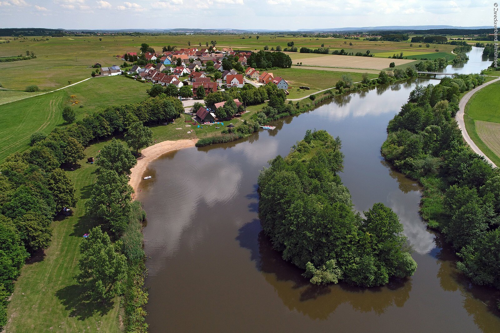 Nach Überquerung der Staatsstraße fahren wir auf der Ortsverbindungsstraße nach Mörlach. Hier halten wir uns links, nach 150 m wieder rechts und radeln auf ebener Strecke durch ländliche Fluren nach Haag. Am Ortseingang von Haag begeben wir uns rechts und nach ca. 1 km fahren wir, beim Feldkreuz rechts abbiegend, au einem befestigten Flurweg nach Oberndorf. An der Einmündung in die Verbindungsstraße nach Ornbau biegen wir zuerst rechts, dann gleich wieder links nach Oberndorf ein und folgen innerorts den Markierungstafeln. Nach einigen hundert Metern treffen wir auf ein Damwildgehege. Begleitet von der nahe fließenden Altmühl setzen wir unsere Route durch Wiesen- und Ackerlandschaft in Richtung Ornbau/Gern fort. Am Ende des Feldweges rechts, eine kurze Anhöhe hinauf und wir kreuzen die Staatsstraße Ornbau-Arberg und fahren geradeaus in Richtung Ornbau. Nach einigen Metern halten wir uns rechts Richtung Badeufer Gern. Hinter dem Kiosk Gern biegen wir rechts ab und fahren entlang des Altmühlüberleiters bis zur Brücke, heir geht's rechts weg, und die nächste Abbiegung wieder rechts. An der Südseite des Zuleiters fahren wir auf ebener gerader Asphaltstraße in Richtung Unterführung, welche wir durchfahren und auf dem vorgegebenen Weg bleibend erreichen wir die Stadtmühle. Von hier aus folgen wir vorbei an weiten Wiesenlandschaften dem Radweg zurück nach Arberg, der zunächst sehr eben, zum Schluß hin leicht ansteigend verläuft.