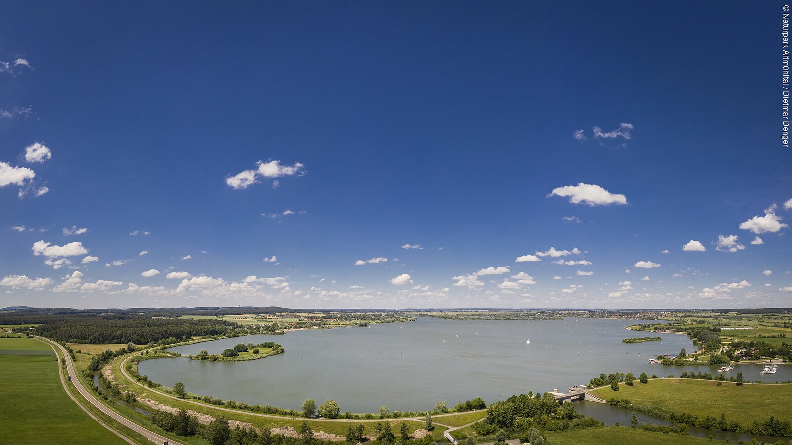 Im weiten Tal der oberen Altmühl nordwestlich von Gunzenhausen liegt der behutsam in die Landschaft eingefügte Altmühlsee. Der von einem Ringdamm eingefasste See ist ideal zum Baden, Wandern, Surfen und Segeln. In der Saison verbindet das Ausflugsschiff "MS Altmühlsee" die Freizeitzentren am Ufer.